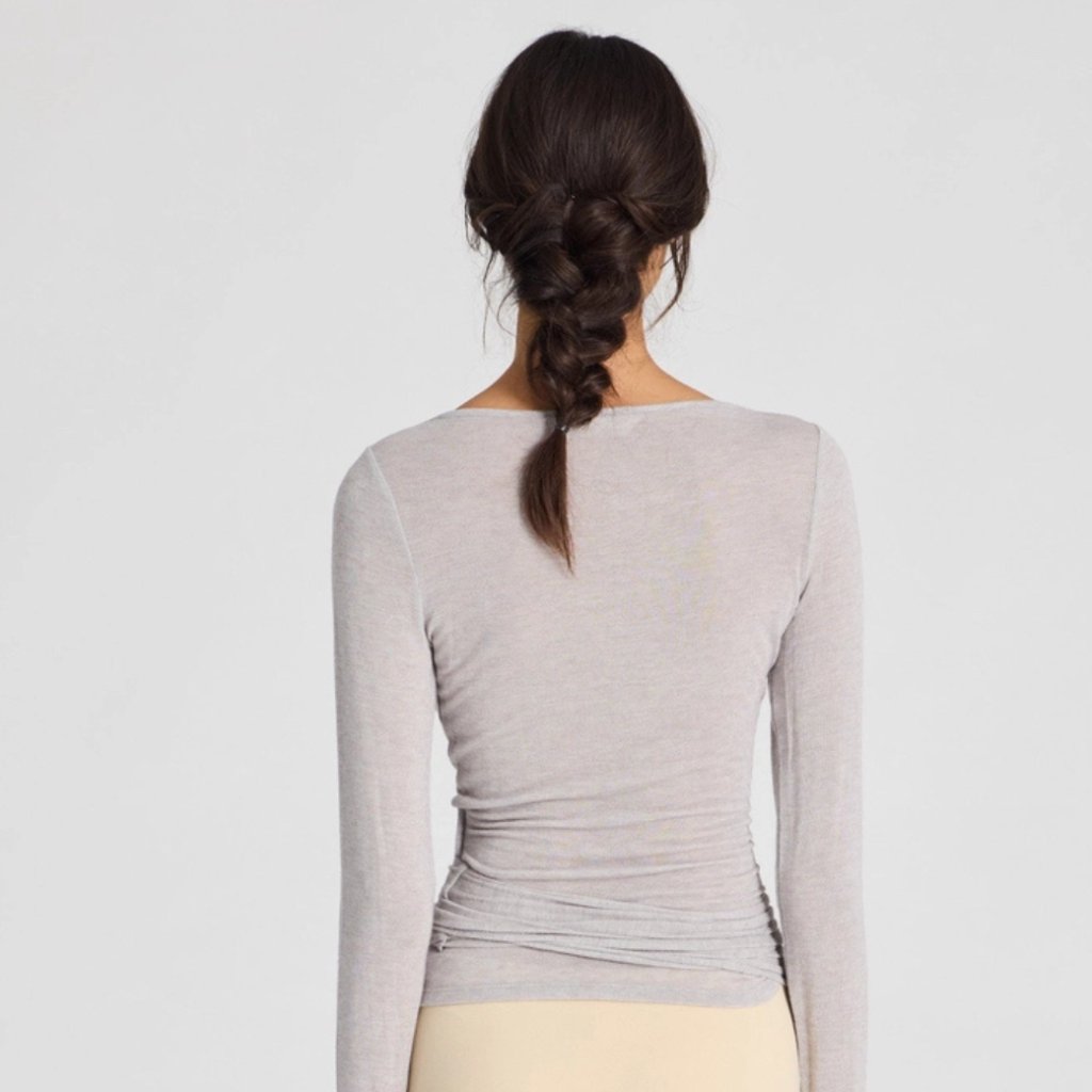 Má zavazování na tenké stužky a je ušité z našeho oblíbeného tenkého úpletu z vlny a viskózy z Itálie. Modelka měří 174 cm a nosí velikost S.