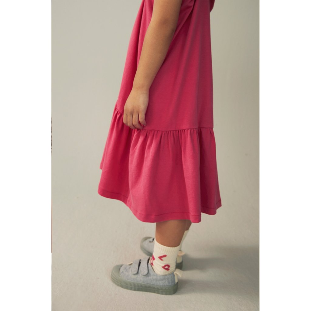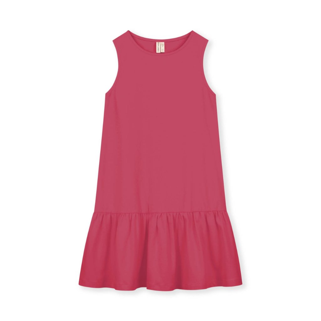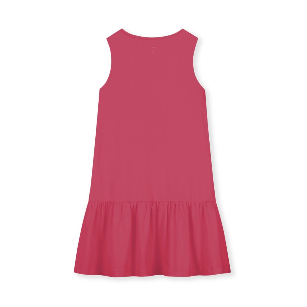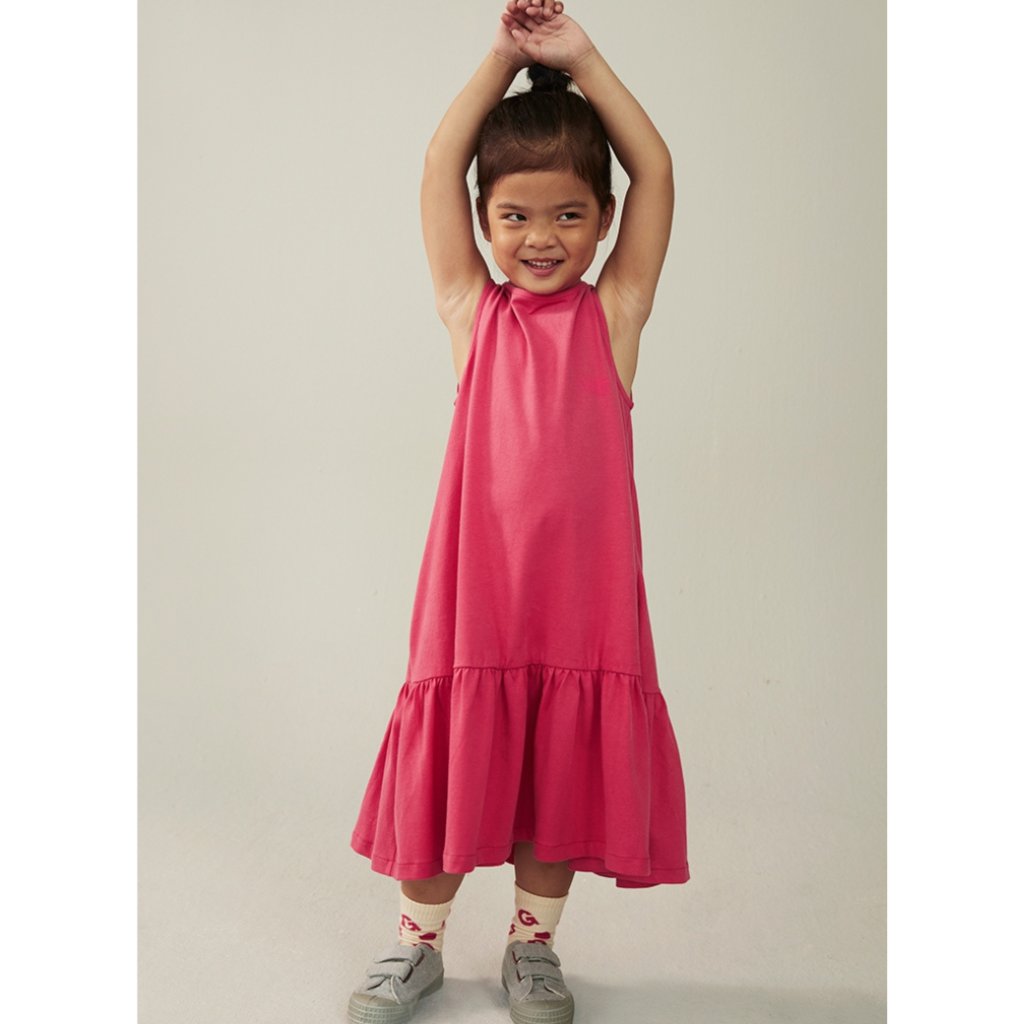 Šaty ve střihu do A, vyrobené z měkkého organického bavlněného žerzeje s detaily volánového lemu. Navrženy bez rukávů, s volným střihem, který sahá pod kolena.