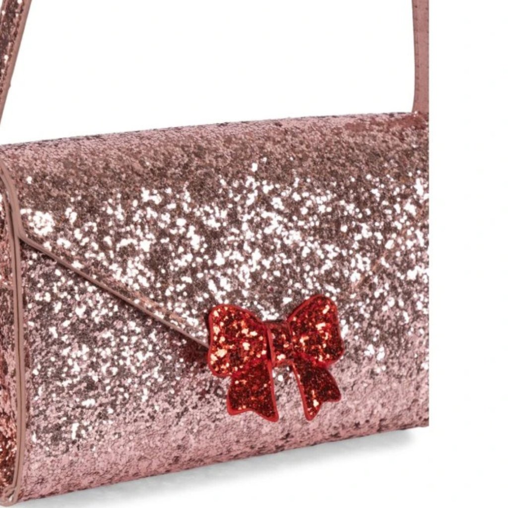 Třpytivá taška s předním zapínáním na druk a úzkým ramenním popruhem.