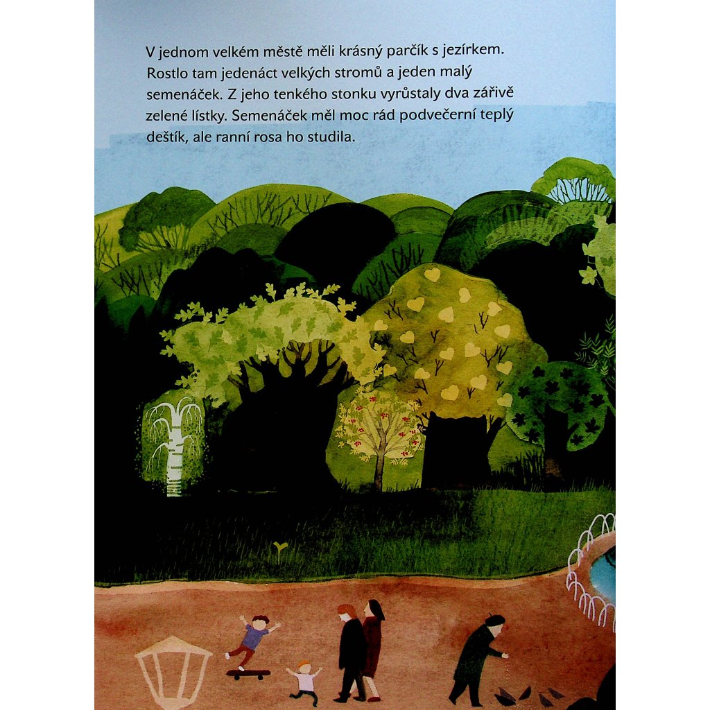 Jednoho dne vykoukl ze země malý zelenkavý semenáček. V údivu si prohlíží vysoké stromy kolem sebe. Kým asi budu, až vyrostu, ptá se. Snad břízou, dubem, nebo kaštanem? Každý strom v parku mu o sobě vypráví spoustu zajímavých věcí, ale semenáček se nejspíš žádnému z nich nepodobá. Nebo přece jen ano? Krátký příběh o důležitých věcech: o hledání sama sebe, o podobnosti a odlišnosti a o tom, že je důležité mít někoho blízkého, kdo se vám aspoň v něčem podobá. Milá obrázková knížka naučí děti rozeznávat jedenáct nejobvyklejších stromů. Díky dojemnému příběhu a půvabným ilustracím si snadno zapamatují, jak stromy vypadají, jakou mají kůru, plody, listy a květy, zkrátka to, čím je každý z nich jedinečný.
