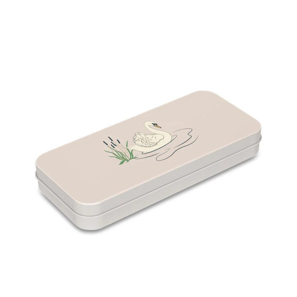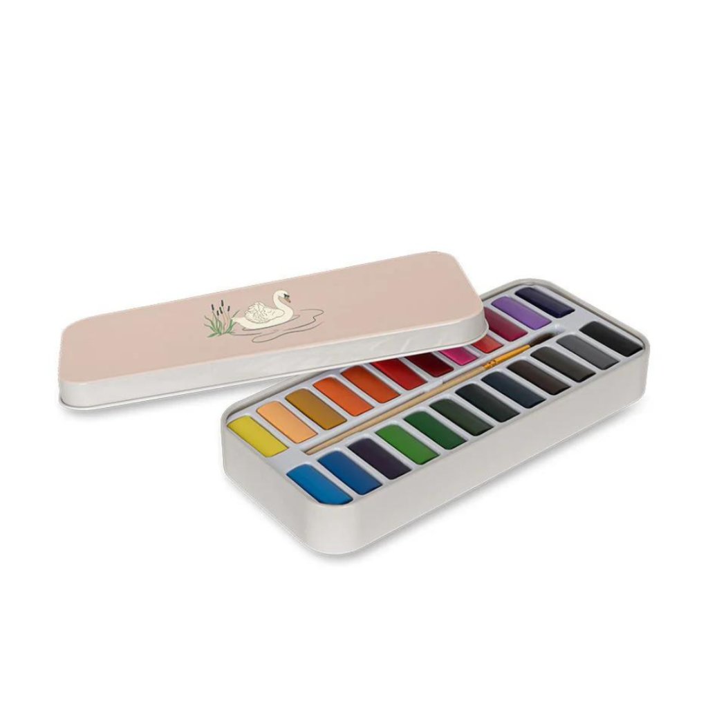 24 vodou ředitelných barev v kovové krabičce. Součástí balení je dřevěný štětec s nylonovými štětinami, které se snadno čistí. Barvy jsou určené k použití na papír.