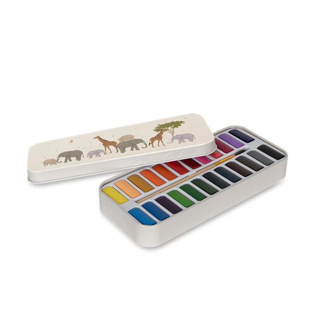 24 vodou ředitelných barev v kovové krabičce. Součástí balení je dřevěný štětec s nylonovými štětinami, které se snadno čistí. Barvy jsou určené k použití na papír.