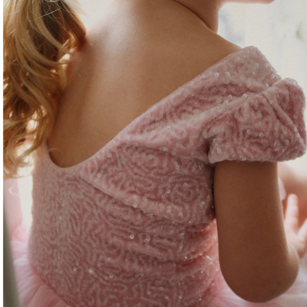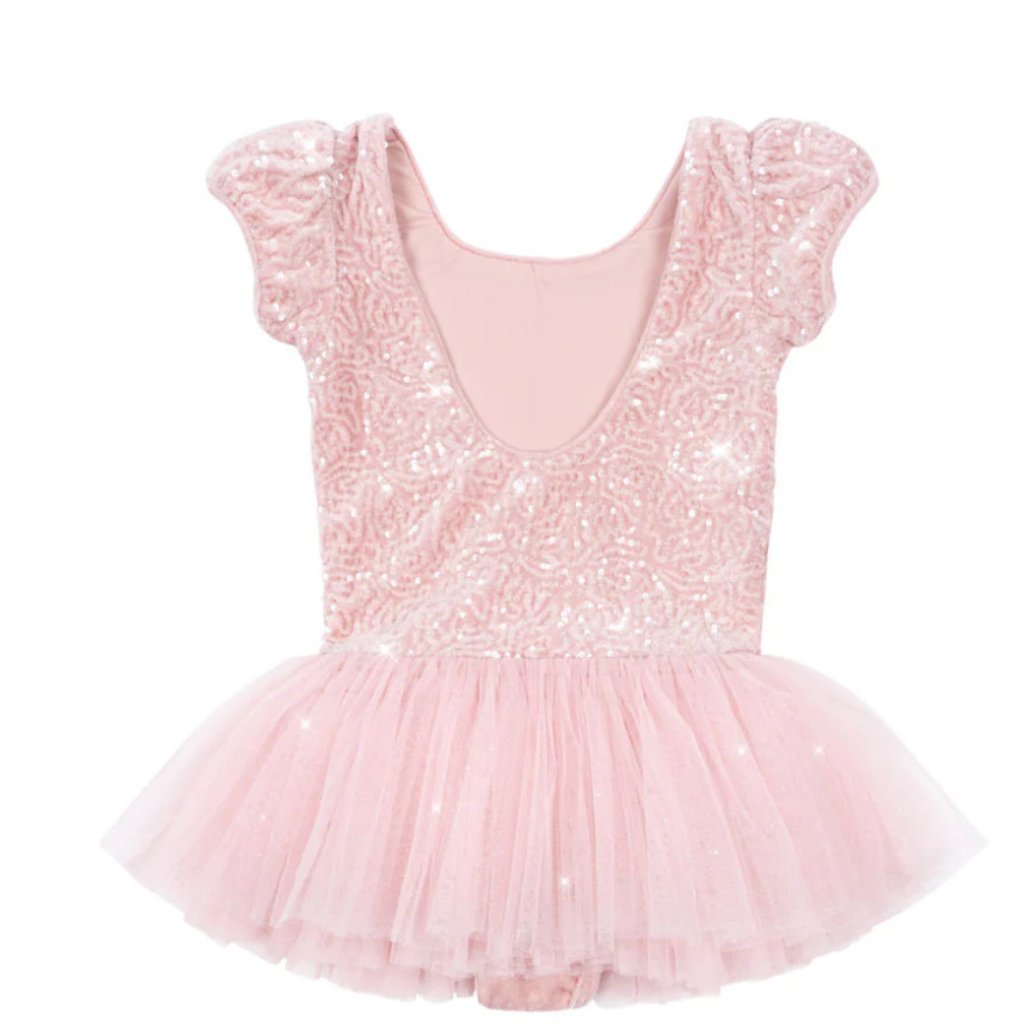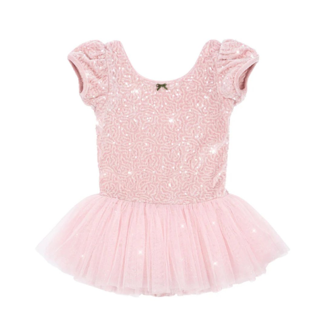 Klasické tutu šaty pro malé baletky s hlubším kulatým výstřihem na zádech a nabíranými rukávky. Navrženy s objemnou tylovou sukní, která je připevněna k přiléhavému body z pružného funkčního materiálu, zdobeného třpytivými flitry.
