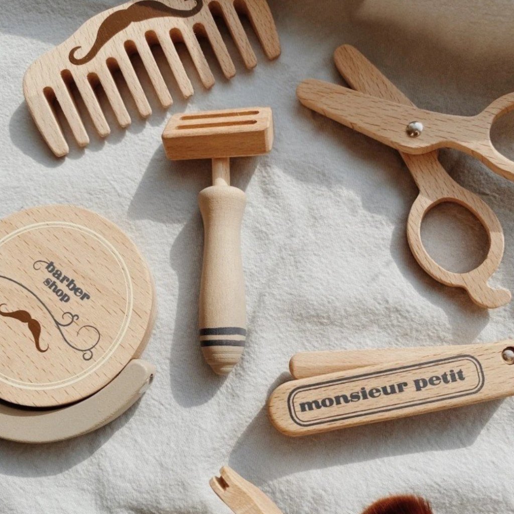 Vyrobeno z udržitelného bukového dřeva a malováno netoxickými barvami. Každý díl sady je realisticky zpracovaný tak, aby děti mohly napodobovat kadeřnické a holičské rituály. Prakticky baleno v sáčku z organické bavlny.