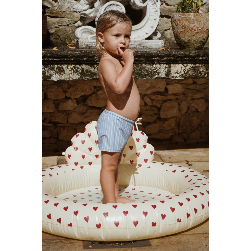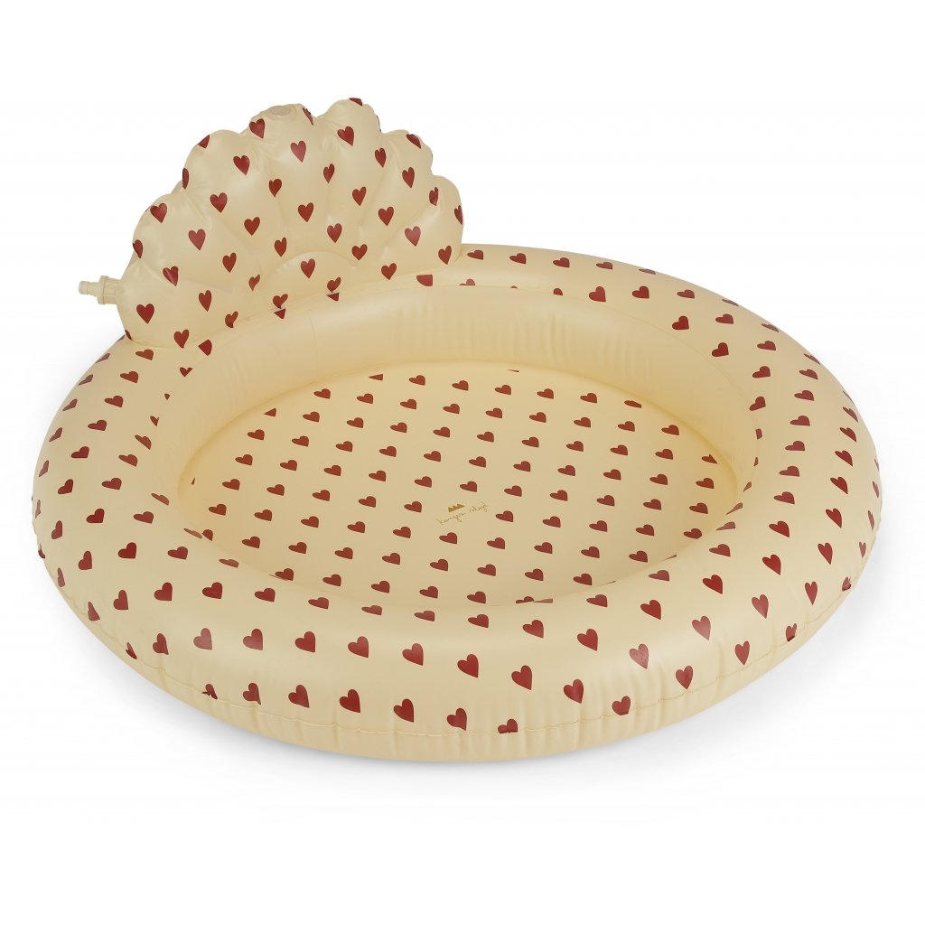 Letní radovánky ještě zábavnější! Stylový nafukovací bazének s potiskem srdíček a integrovaným postřikovačem přinese dětem osvěžení a spoustu legrace. Stačí připojit hadici a voda se promění v osvěžující spršku.