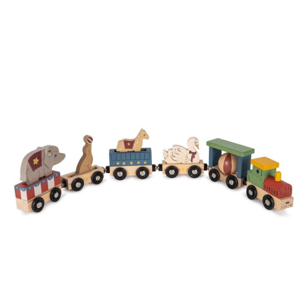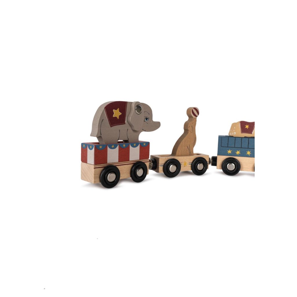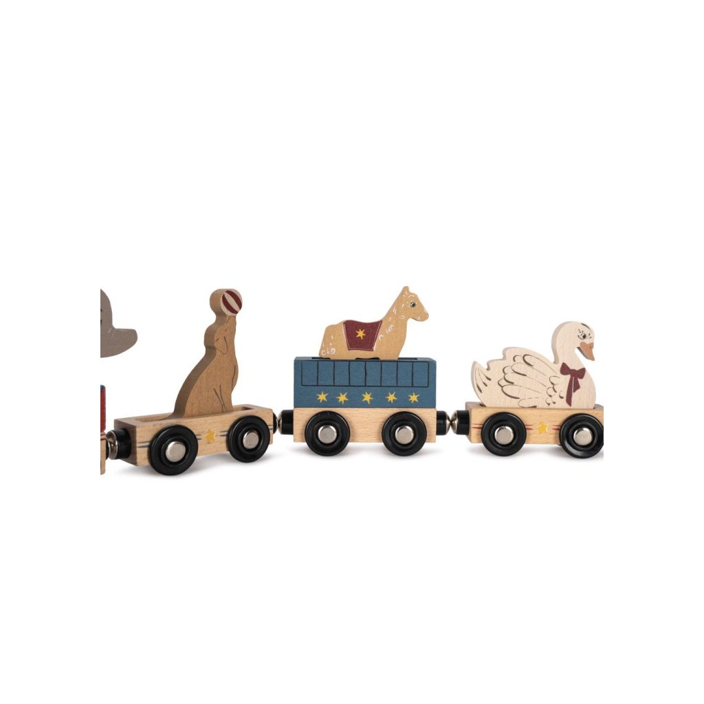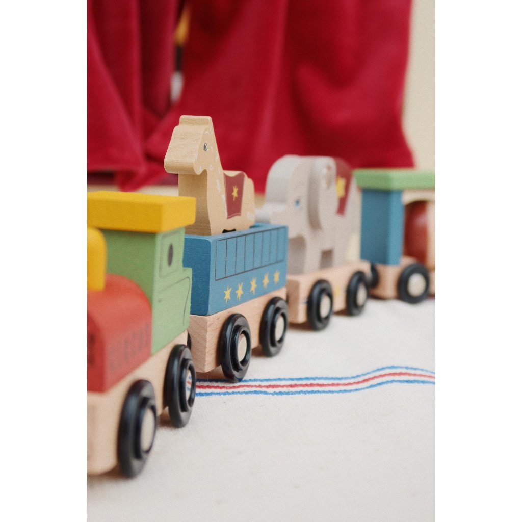 Kouzelný dřevěný vláček s jednou lokomotivou a pěti vagónky se hladce spojuje pomocí magnetů a zve děti ke hře plné fantazie. Každý vagónek veze jiné roztomilé zvířátko, takže si děti při hraní nejen staví vlastní vlakovou soupravu, ale zároveň se učí zvířata poznávat, pojmenovávat a zapojovat do příběhů.