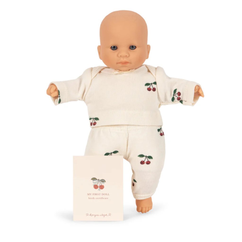 My First Mini Doll je zmenšená verze klasických panenek, ideální jako první panenka pro nejmenší děti. Má měkké, poddajné tělíčko s potištěnou látkou a je oblečená do jednoduchého dvoudílného bavlněného oblečku. Přichází v roztomilé dárkové krabičce a přirozeně zve k mazlení i první hře na péči.