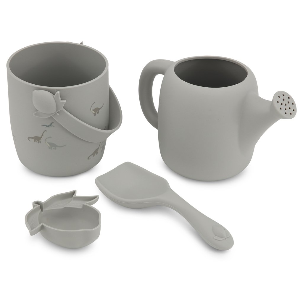 Stylový a praktický set na písek s motivy dinosaura od značky Konges Slojd se stane nepostradatelným společníkem na pláž i na pískoviště. Díky měkkému silikonu je odolný, lehký a snadno se čistí – ideální i na cestování, protože se pohodlně vejde do tašky či kufru.