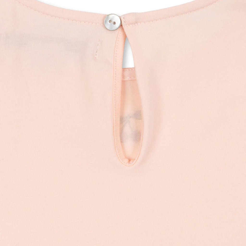 Šaty jsou navržené s bohatou tylovou sukní, která je připojena k přiléhavému body z pružné bavlněné látky. Jemné dekorativní flitry dodávají modelu slavnostní třpyt a podtrhují baletní eleganci, zatímco elastický materiál zajišťuje pohodlí při nošení.