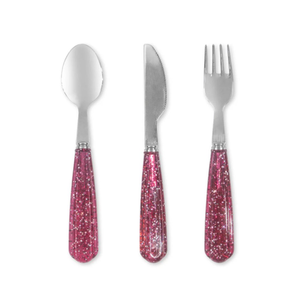 Obsahuje lžíci, vidličku a nůž s třpytivými rukojeťmi.