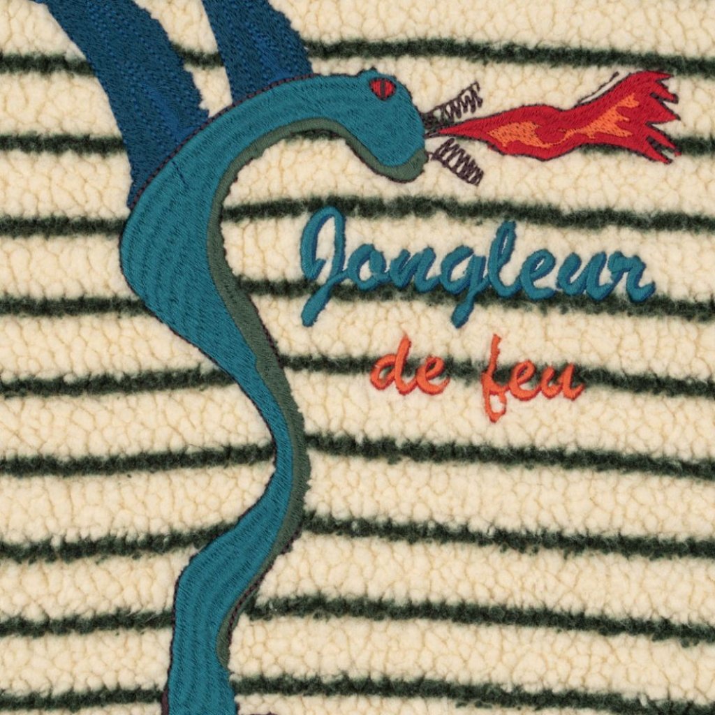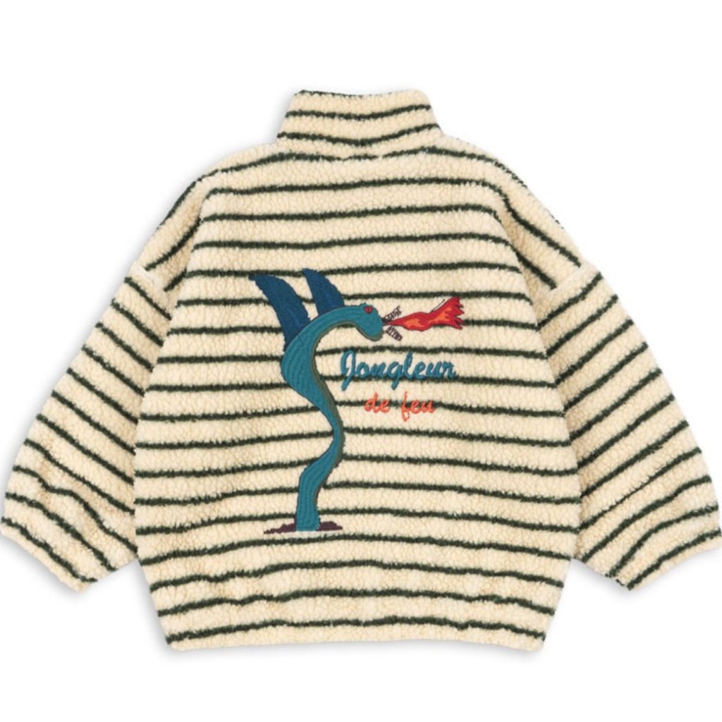 Hřejivá bunda z měkkého fleecu s vnitřní podšívkou pro extra pohodlí. Vysoký límec, pružné manžety a celopropínací zip z ní dělají ideální kousek pro chladnější dny. Na zádech zdobená ohnivým drakem – ilustrací vytvořenou synem Rosie, Jackem.
