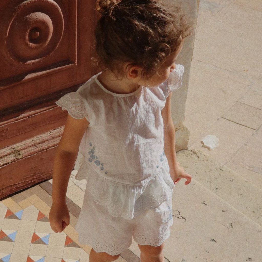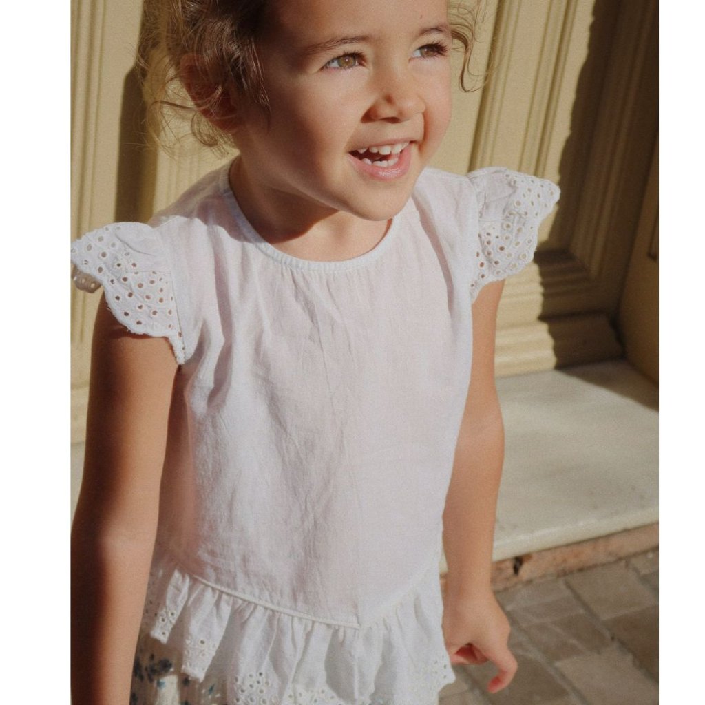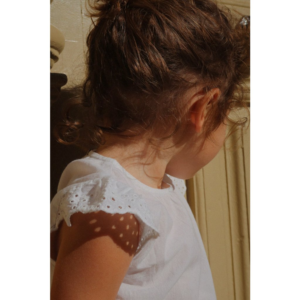 Spodní lem a rukávky zdobí propracovaná výšivka ve stylu broderie anglaise, která celému kousku dodává nostalgický šarm a výjimečně něžný vzhled. Skvělý na teplé letní dny i jako slavnostnější kousek do dětského šatníku.