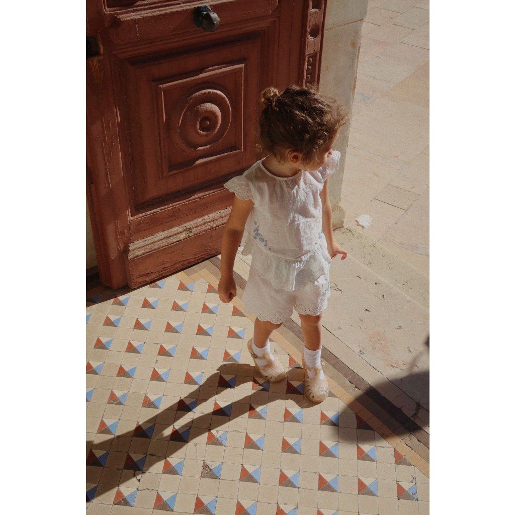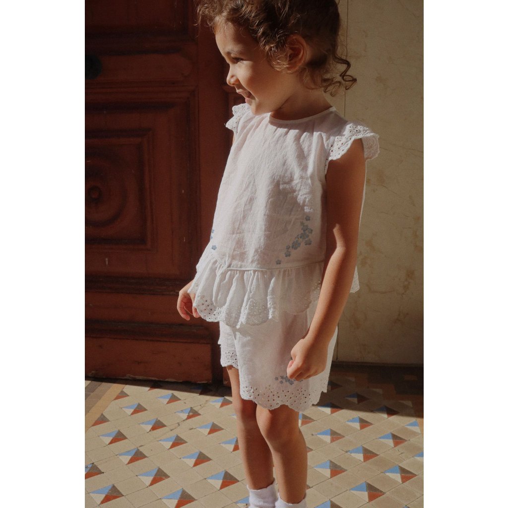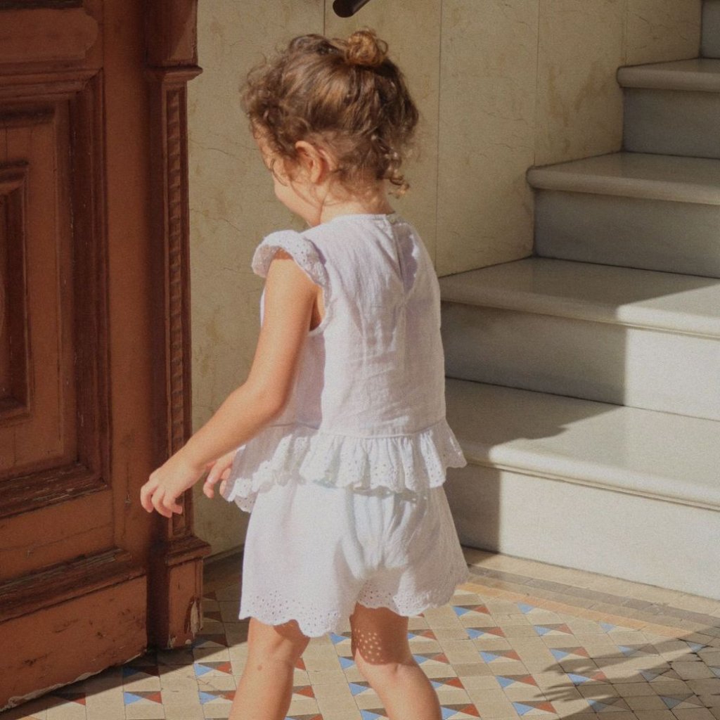 Spodní lem a rukávky zdobí propracovaná výšivka ve stylu broderie anglaise, která celému kousku dodává nostalgický šarm a výjimečně něžný vzhled. Skvělý na teplé letní dny i jako slavnostnější kousek do dětského šatníku.