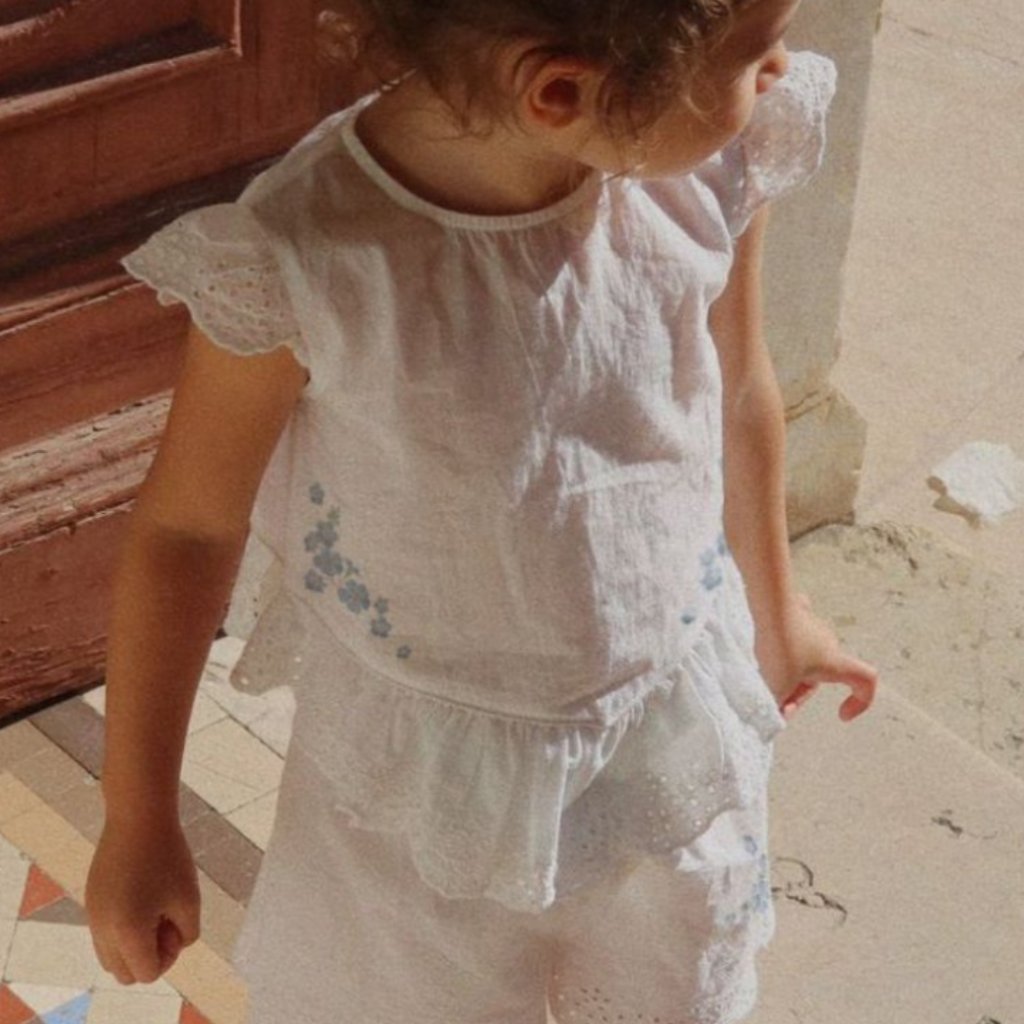 Spodní lem a rukávky zdobí propracovaná výšivka ve stylu broderie anglaise, která celému kousku dodává nostalgický šarm a výjimečně něžný vzhled. Skvělý na teplé letní dny i jako slavnostnější kousek do dětského šatníku.