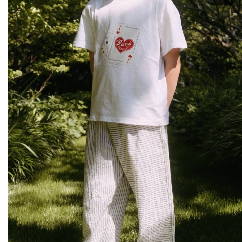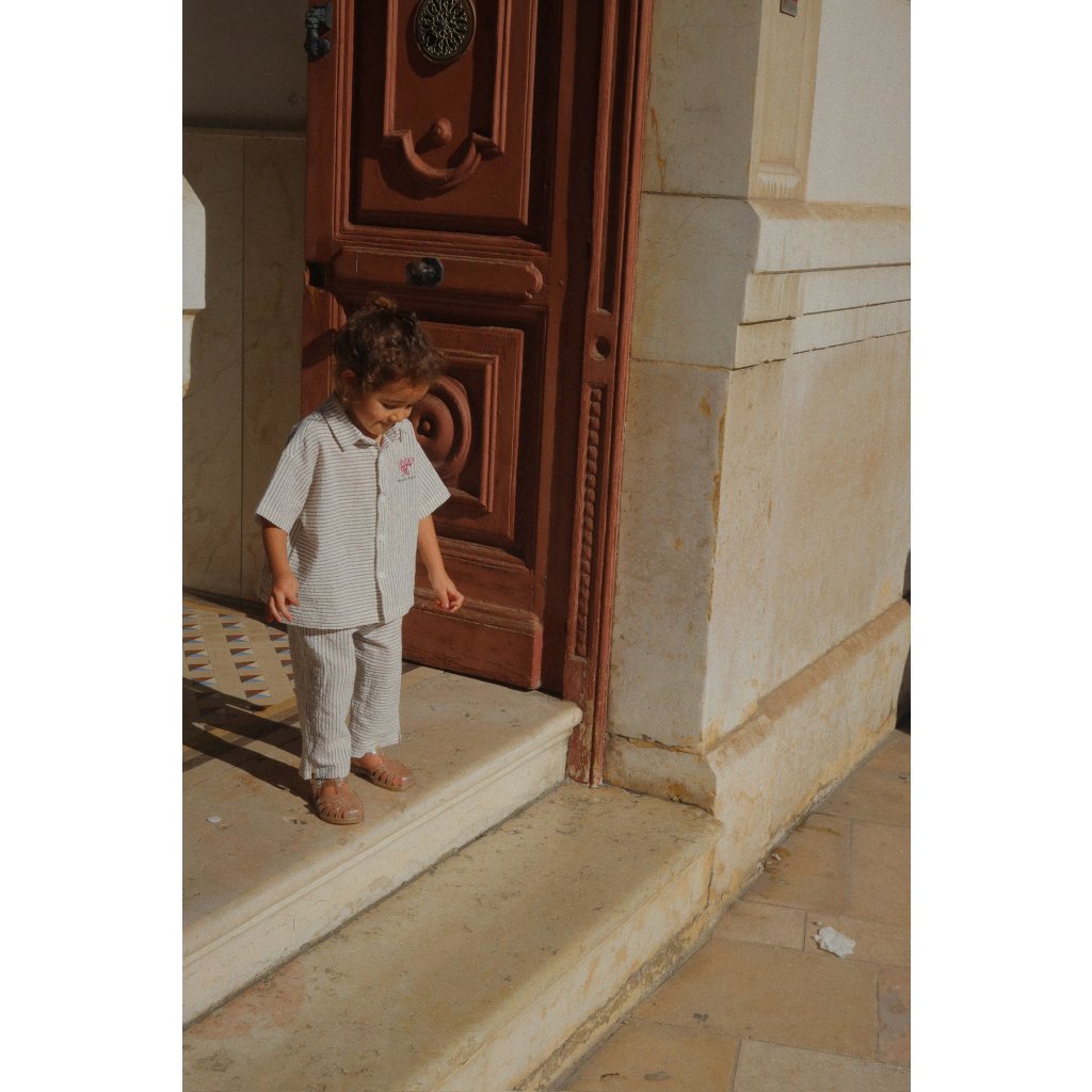 Pohodlné kalhoty z lehkého a prodyšného bavlněného seersuckeru s přirozeně mačkaným vzhledem. Uvolněný střih s elastickým pasem a rovnými nohavicemi. Na zadní straně roztomilá kapsa a logo RHW x Konges Slojd.