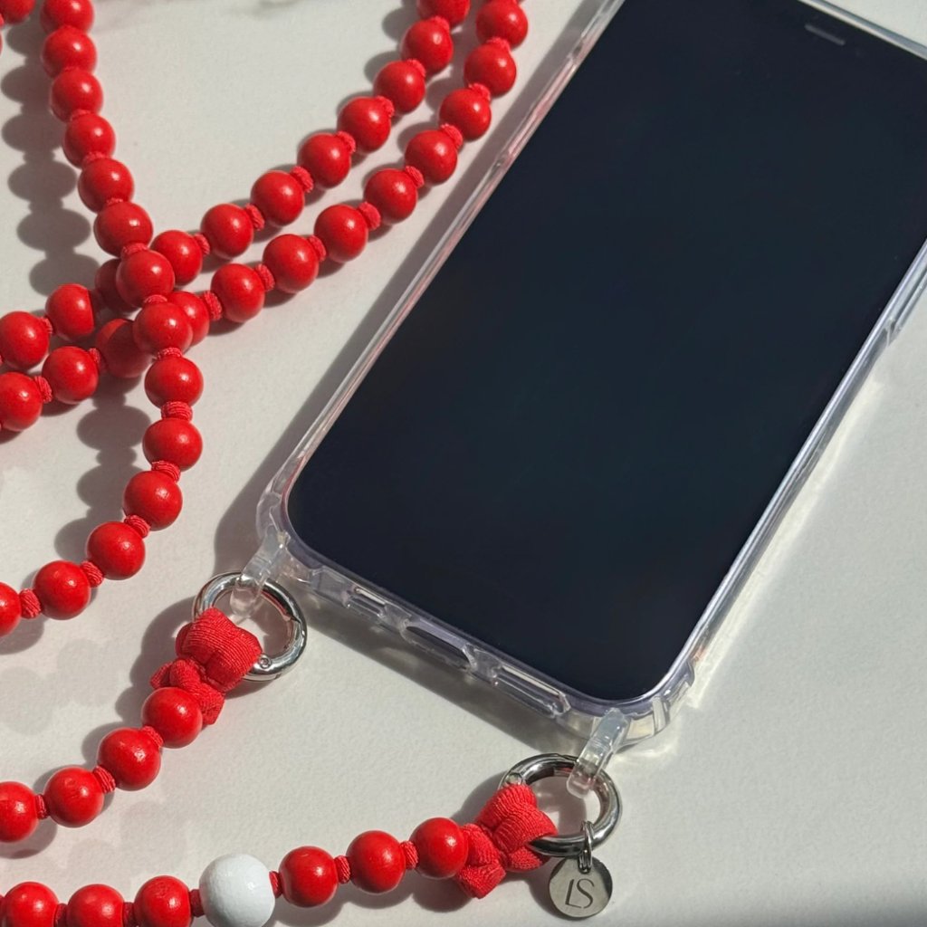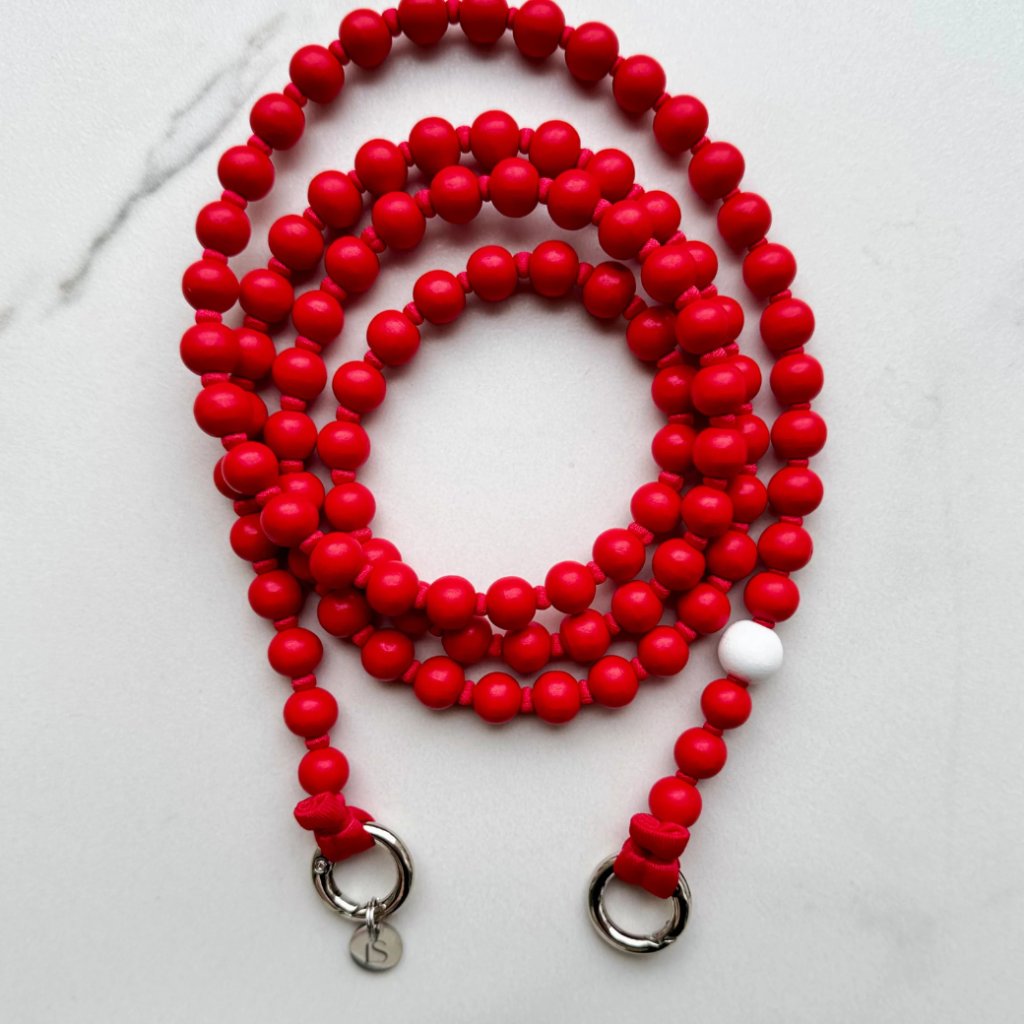 Popruh na telefon z červených dřevěných korálků s kontrastním bílým korálkem, doplněný kvalitními kovovými karabinami pro snadné připnutí ke krytu.