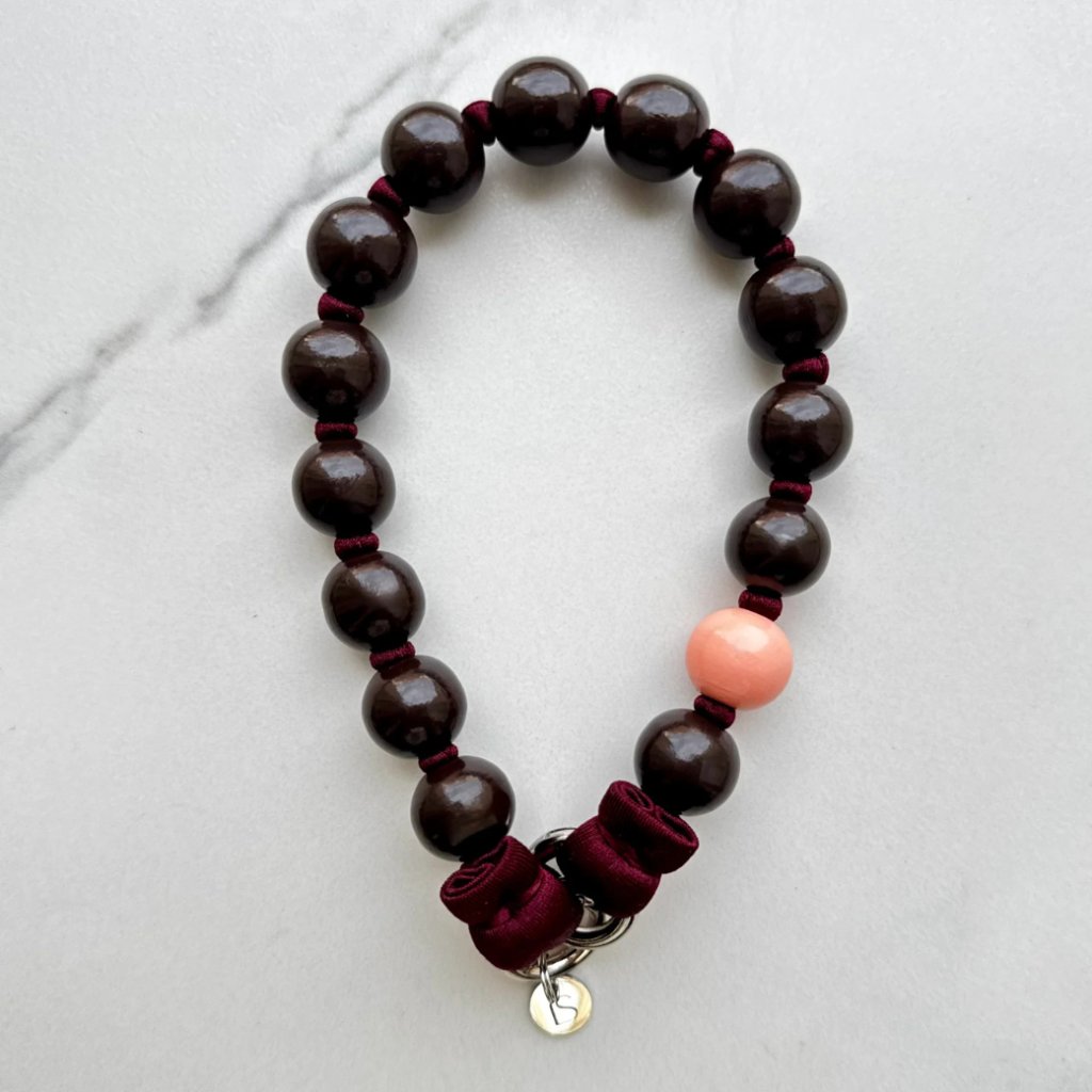 Krátký popruh na telefon z velkých hnědých dřevěných korálků s kontrastním růžovým detailem na vínové šňůrce, doplněný kvalitními kovovými karabinami pro snadné připnutí ke krytu.