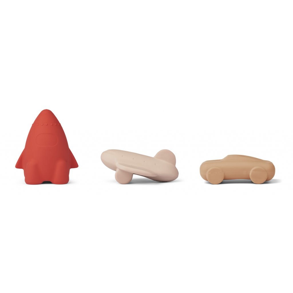 Sada tří hraček ve tvaru rakety, letadla a auta přinese dětem spoustu radosti při hře doma i ve vaně. Díky přírodnímu kaučuku jsou figurky příjemné na dotek a bezpečné i pro nejmenší.