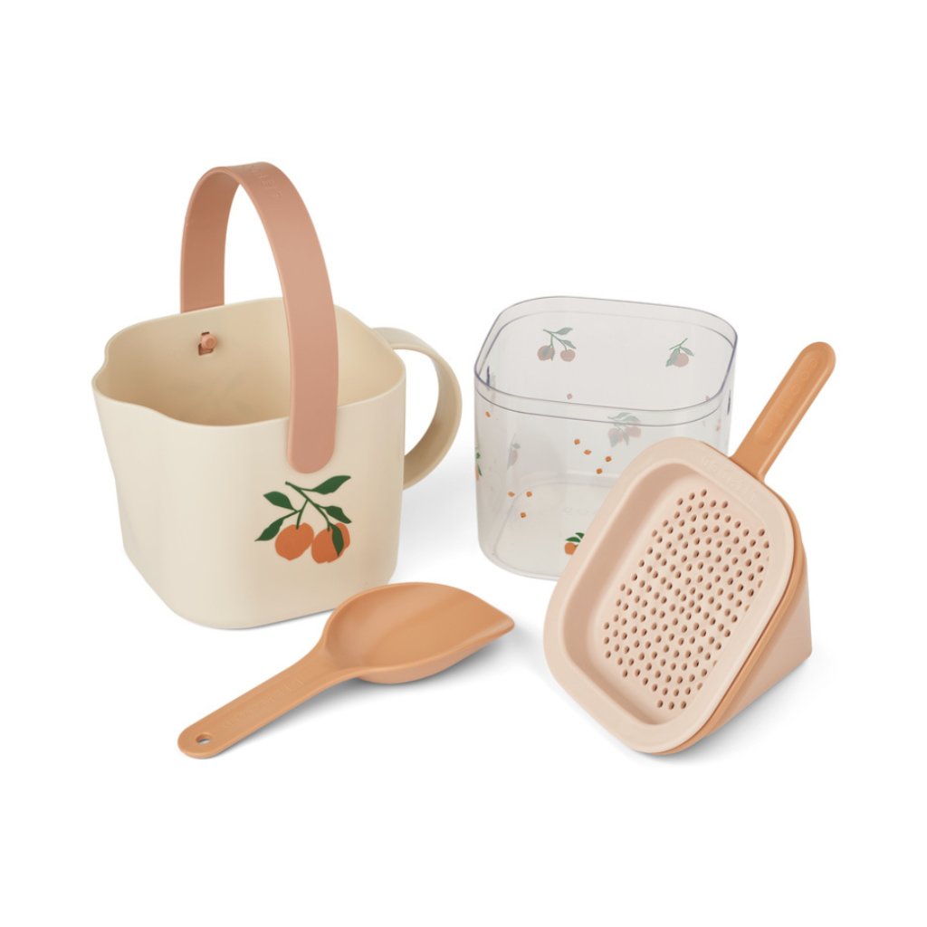 Set na písek je ideální pro výlety na pláž a objevování přírody. Obsahuje konvičku, průhledný kbelík, trychtýř, lopatku a síto, všechny navržené tak, aby zpříjemnily venkovní hraní a podpořily zvědavost vašich malých objevitelů.