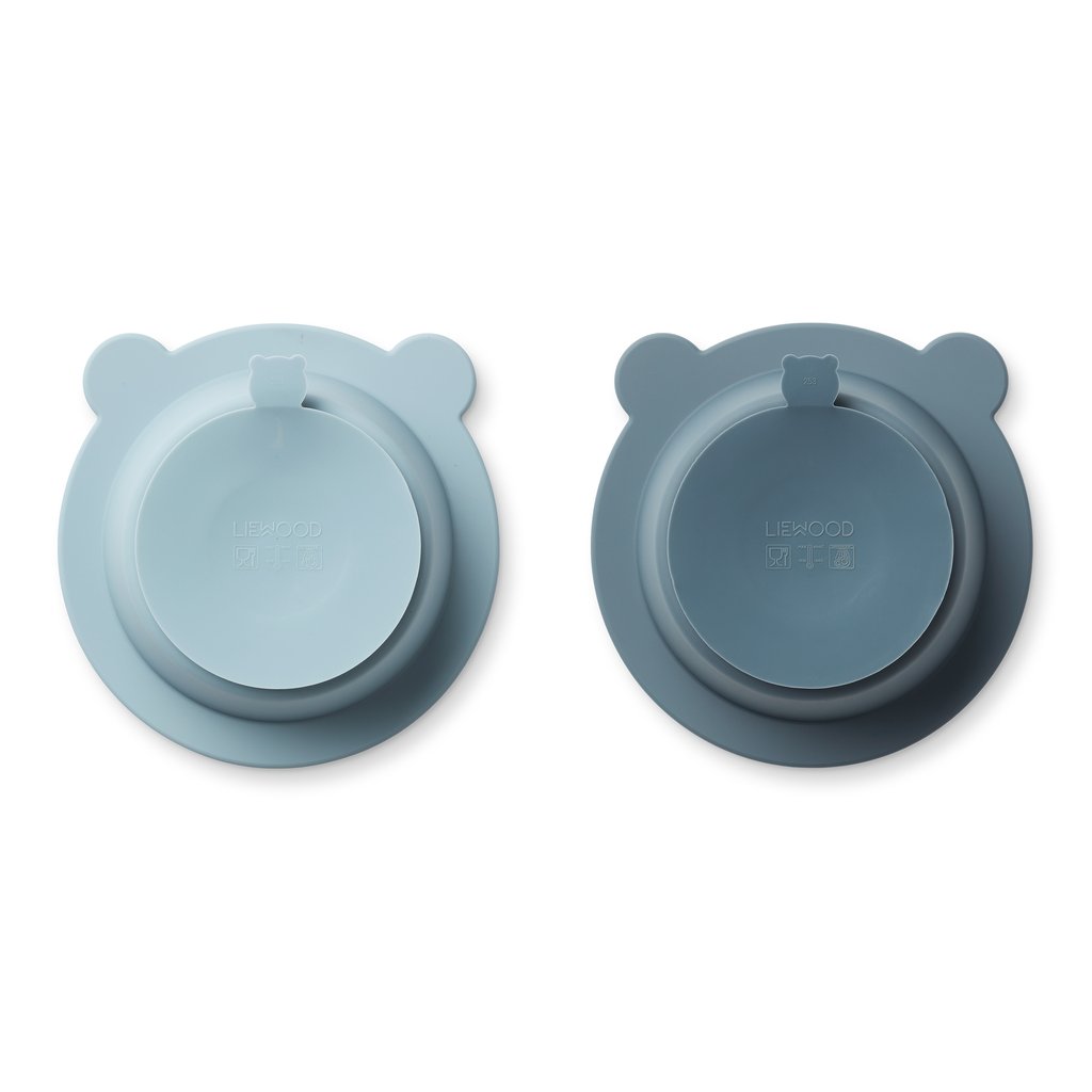 Roztomilé misky s oušky z nerozbitného silikonu od Liewood. Silikonový materiál přilne ke stolu.