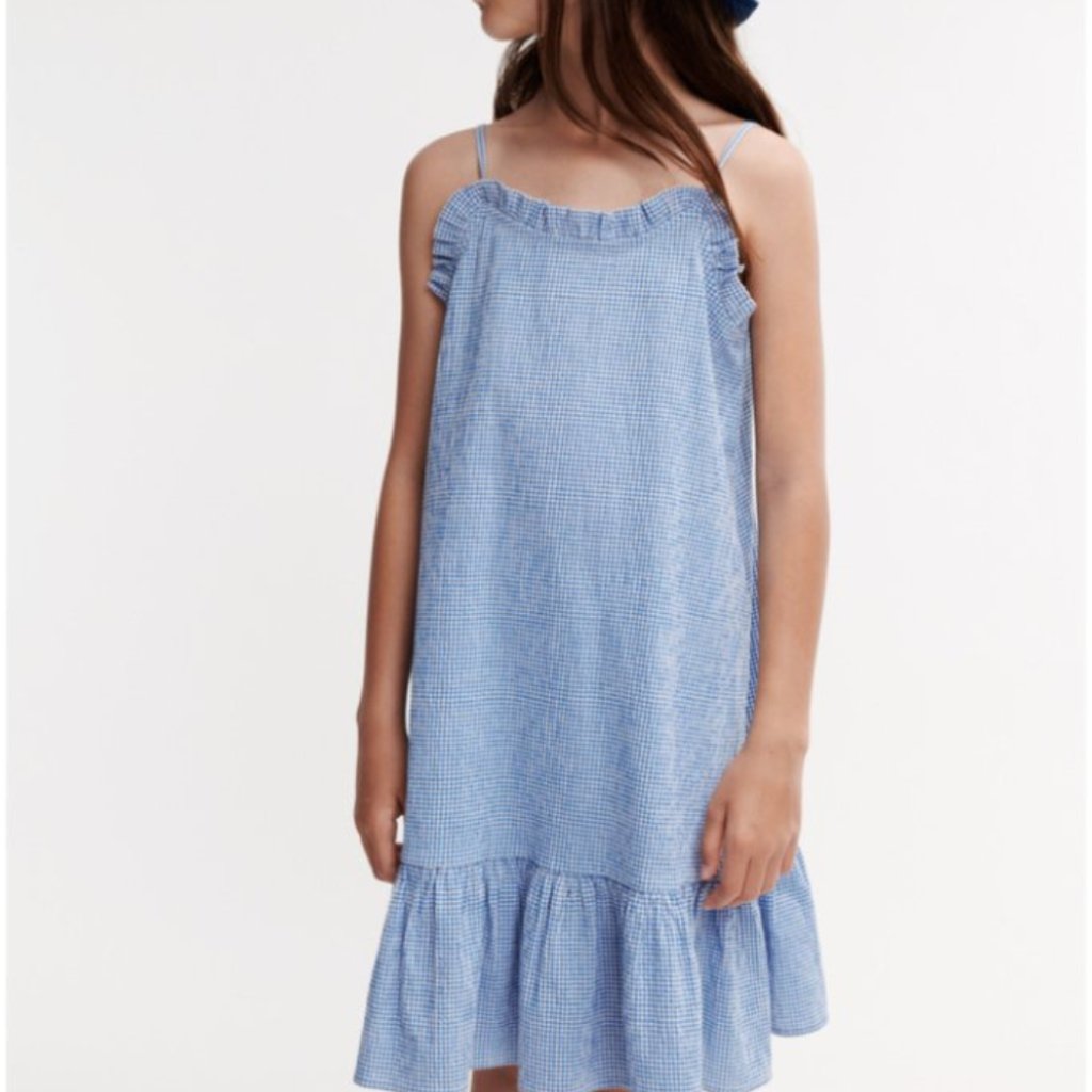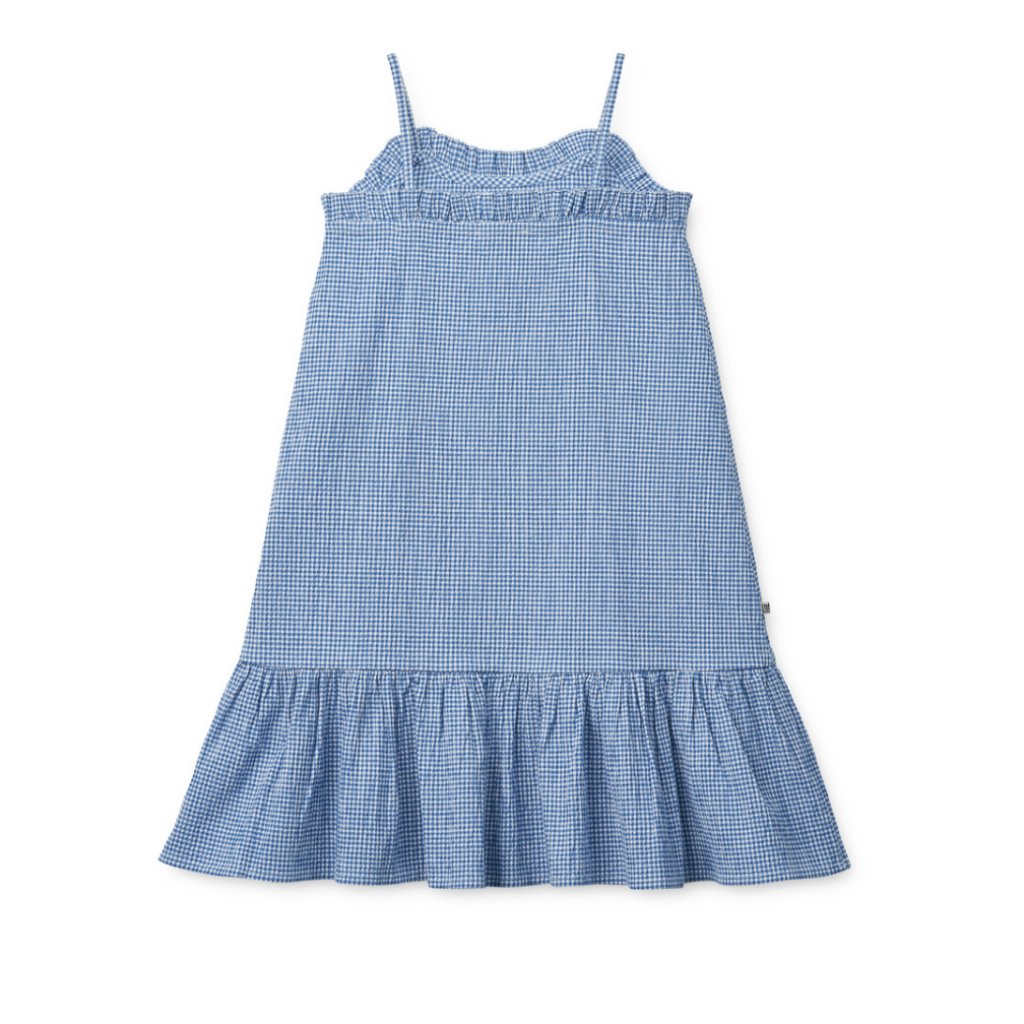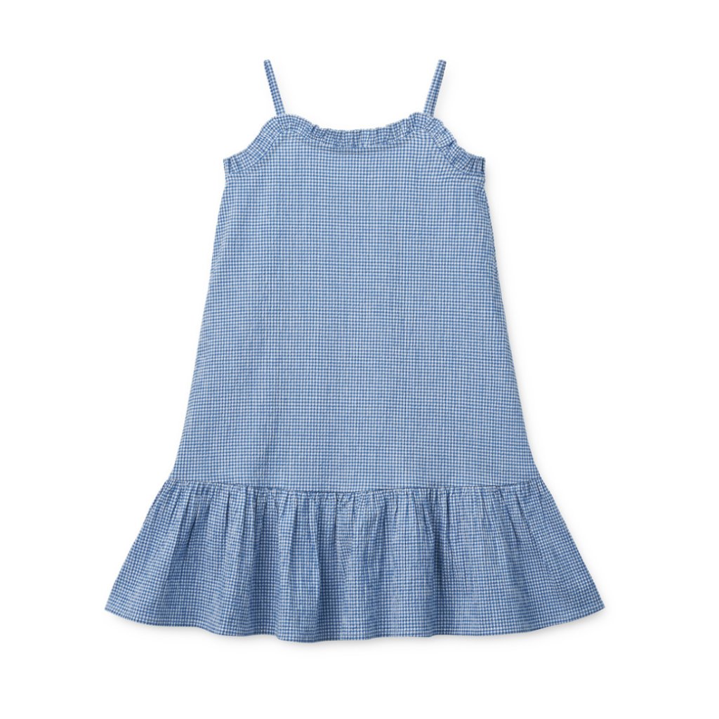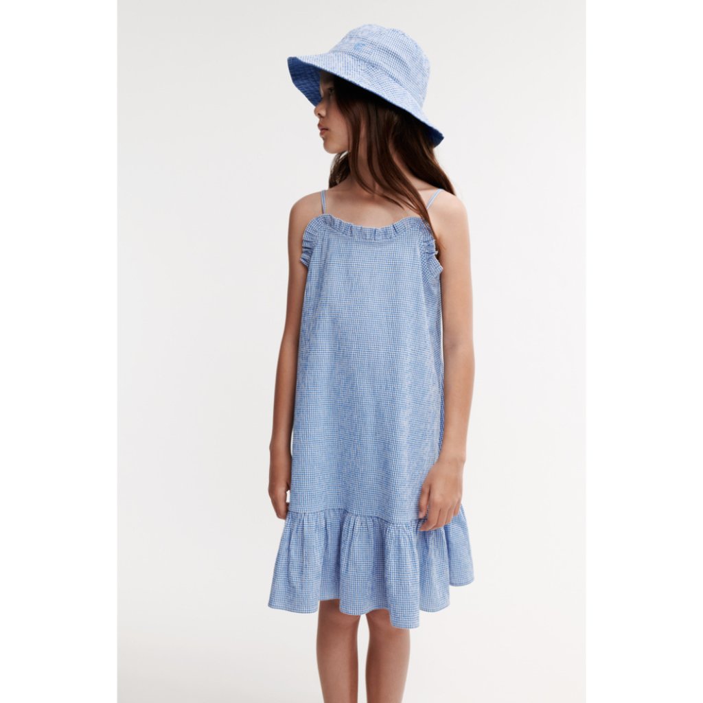 Šaty Sophia v jemně kostkované seersucker tkanině jsou ideální volbou na slunečné dny. Tenké ramínka a volánové detaily je činí zábavné a prodyšné. Skvěle se hodí s kšiltovkou a sandály Morris pro cool vzhled.