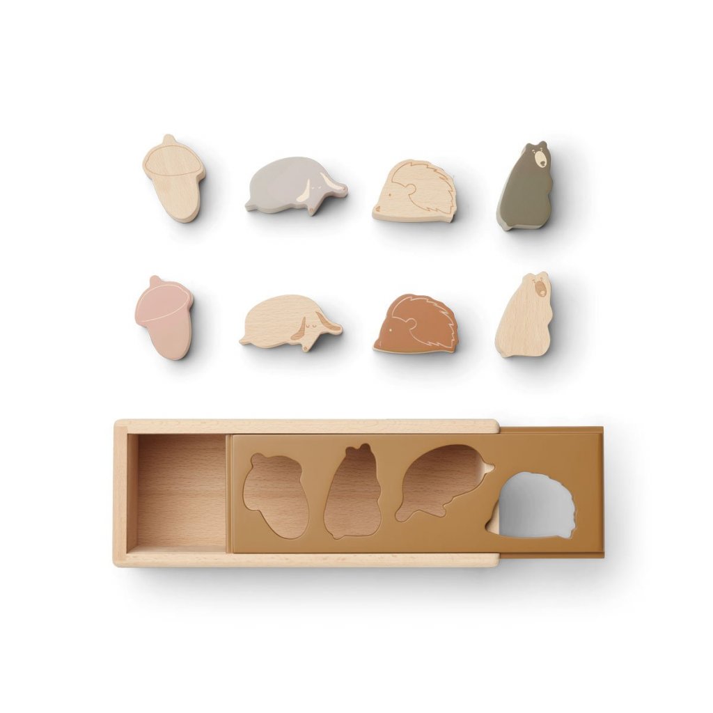 Box obsahuje 8 dřevěných zvířátek, které se vkládají do správných otvorů v horní části. Při hře si děti procvičují jemnou motoriku, koordinaci oko–ruka a schopnost rozlišovat tvary. Díky přírodnímu bukovému dřevu je hračka odolná a vydrží po generace.