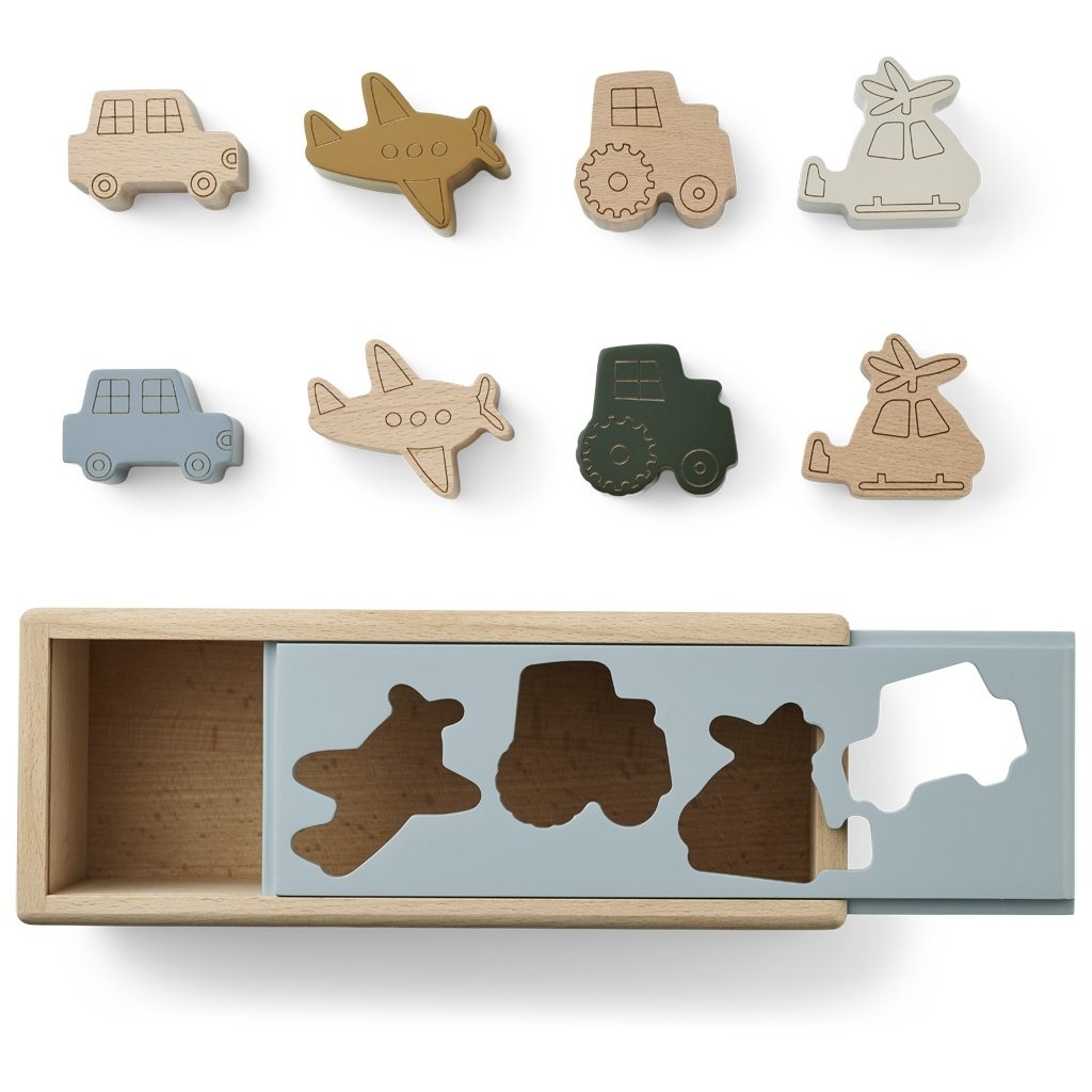 Box obsahuje 8 dřevěných tvarů dopravních prostředků, které děti vkládají do správných otvorů. Při hře si procvičují jemnou motoriku, koordinaci a schopnost rozlišovat tvary. Díky přírodnímu bukovému dřevu je hračka odolná, bezpečná a vydrží po generace.