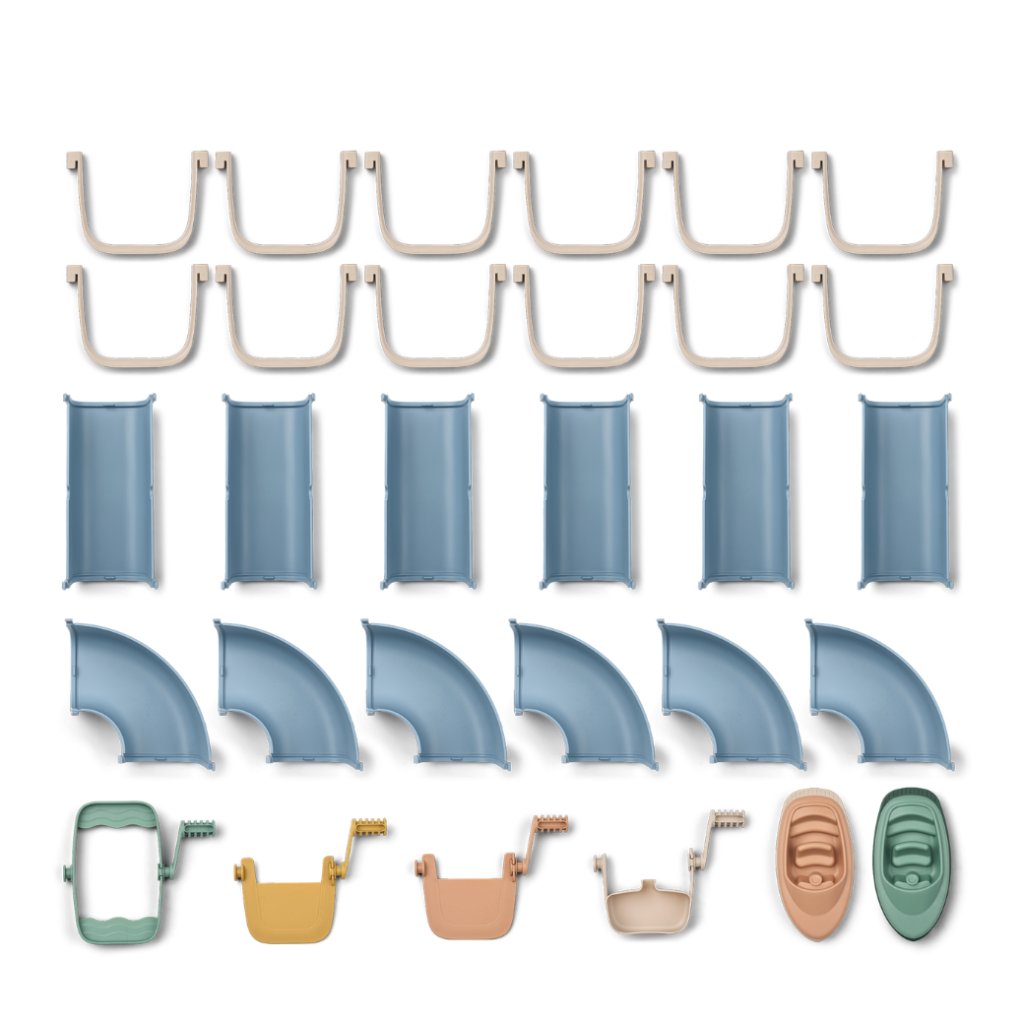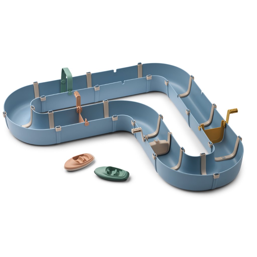 Vodní set CASSIAN promění zahradu nebo terasu v malé inženýrské hřiště. Děti mohou stavět klikaté kanály, pouštět lodičky, roztáčet vodní kolo i zvedat brány. Při nalévání, přelévání a pozorování proudění objevují, jak se voda pohybuje a reaguje – hravou a přirozenou formou.