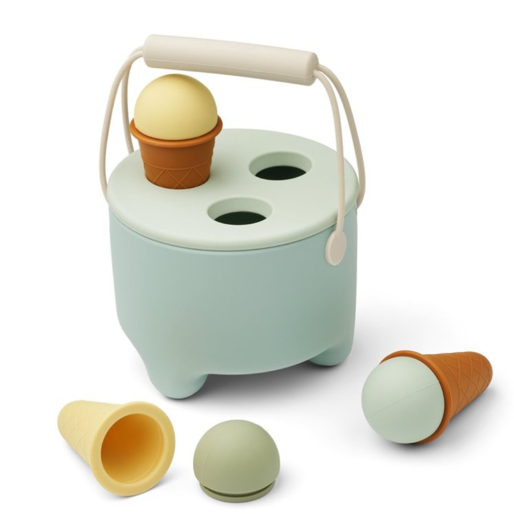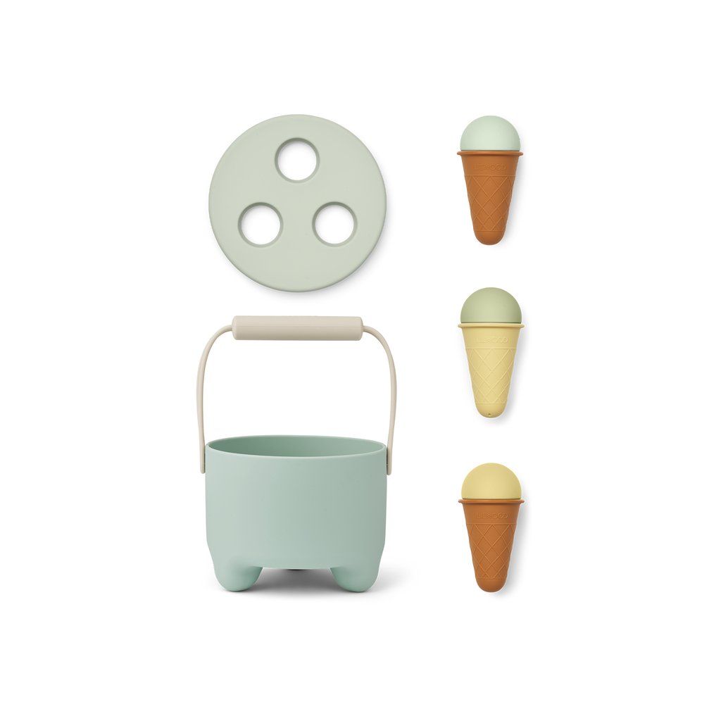 Snadno přenosná hravá sada obsahuje kbelík, držák na zmrzlinu a tři zmrzliny, které lze rozložit a složit podle libosti vašeho dítěte.