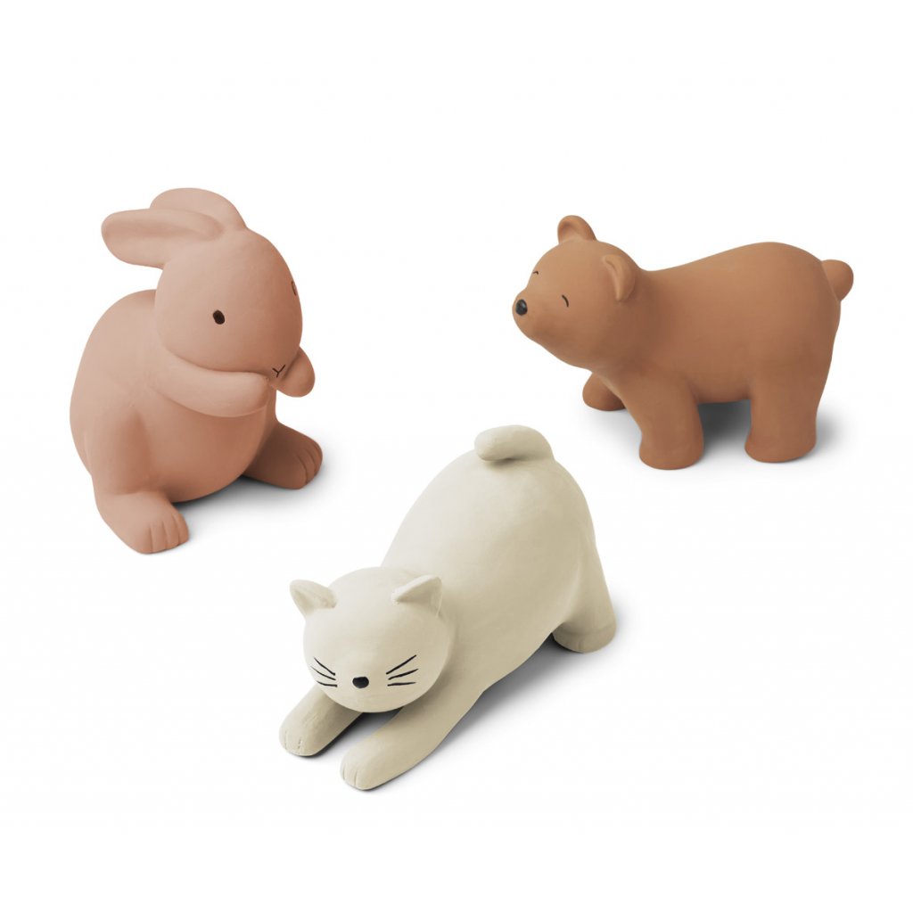 Součástí sady je kočička, zajíček a medvídek v jemných tlumených barvách. Hračky jsou vyrobeny ze 100% přírodního kaučuku, příjemné na dotek a zcela bezpečné – nemají žádný otvor, takže se do nich nedostane voda. Díky tomu jsou hygienické a vhodné i pro nejmenší děti.