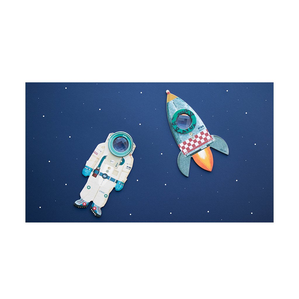Kaleidoskop ve tvaru rakety promění každý pohled v barevné vesmírné obrazy. Děti se díky němu vydají na kouzelnou cestu, kde se před očima roztáčí nové a nové vzory.