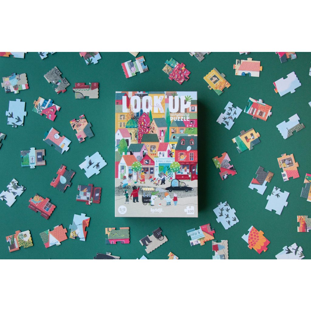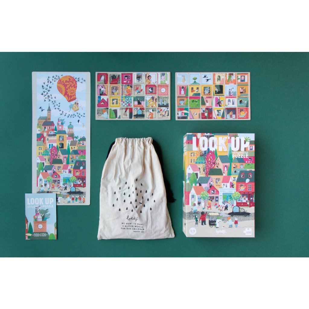 Puzzle Londji Look Up vtáhnou děti do malebného města, kde se na každém místě děje něco jiného. Při skládání se děti učí pozorovat detaily, vyprávět vlastní příběhy a rozvíjet fantazii. Díky 48 doprovodným žetonkům mohou hledat jednotlivé ilustrace a proměnit skládání v hravou detektivní výpravu.