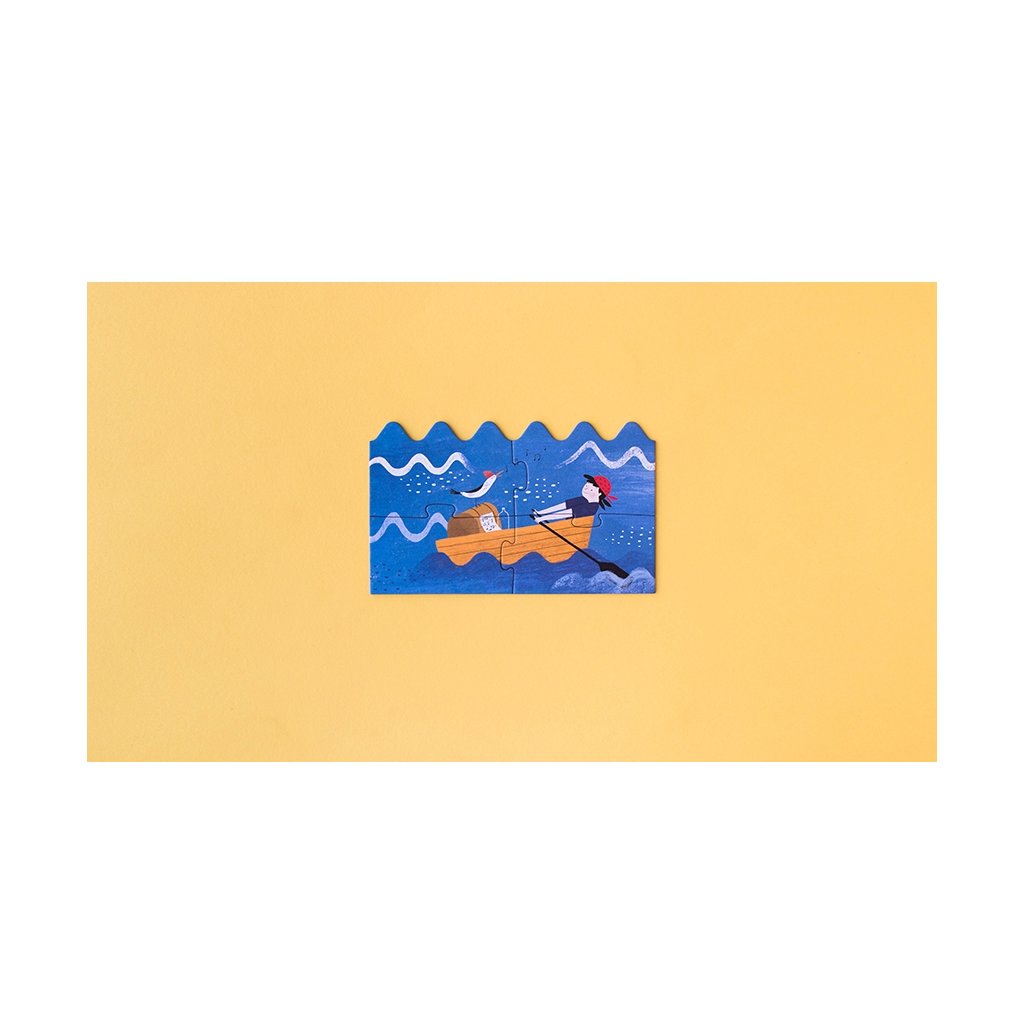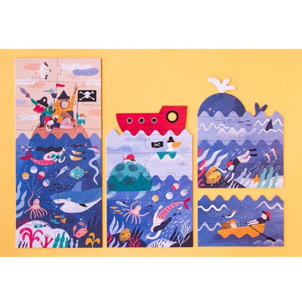 Puzzle Londji Objevte poklad vtáhnou děti do světa dobrodružství, kde se fantazie potkává s mořskými vlnami. Čtyři vrstvy skládanky ukazují postupně celý příběh – od plavby po oceánu až po nalezení pokladu. Každá úroveň je o něco složitější, takže děti rostou spolu s příběhem i svou dovedností.