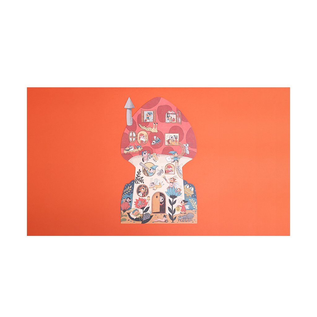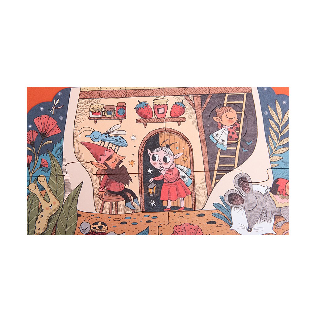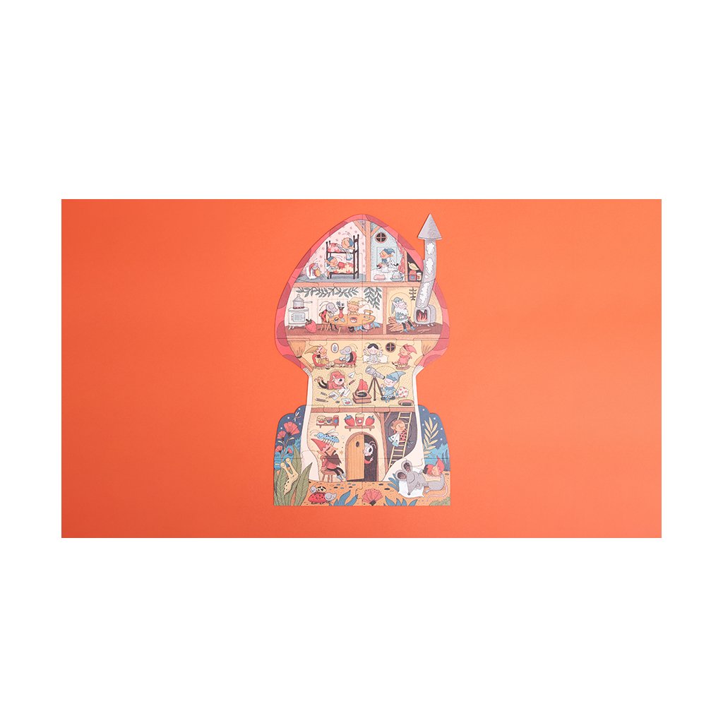 Na jedné straně najdeme vnější stranu houby a na druhé vnitřní. Jakmile bude houbový domeček (10 kusů) sestaven, bude dítě schopno vložit kusy do domečku (8 kusů), uspat různé postavičky a zároveň s nimi samo usnout. Dílky jsou velké, určené pro malé ruce.