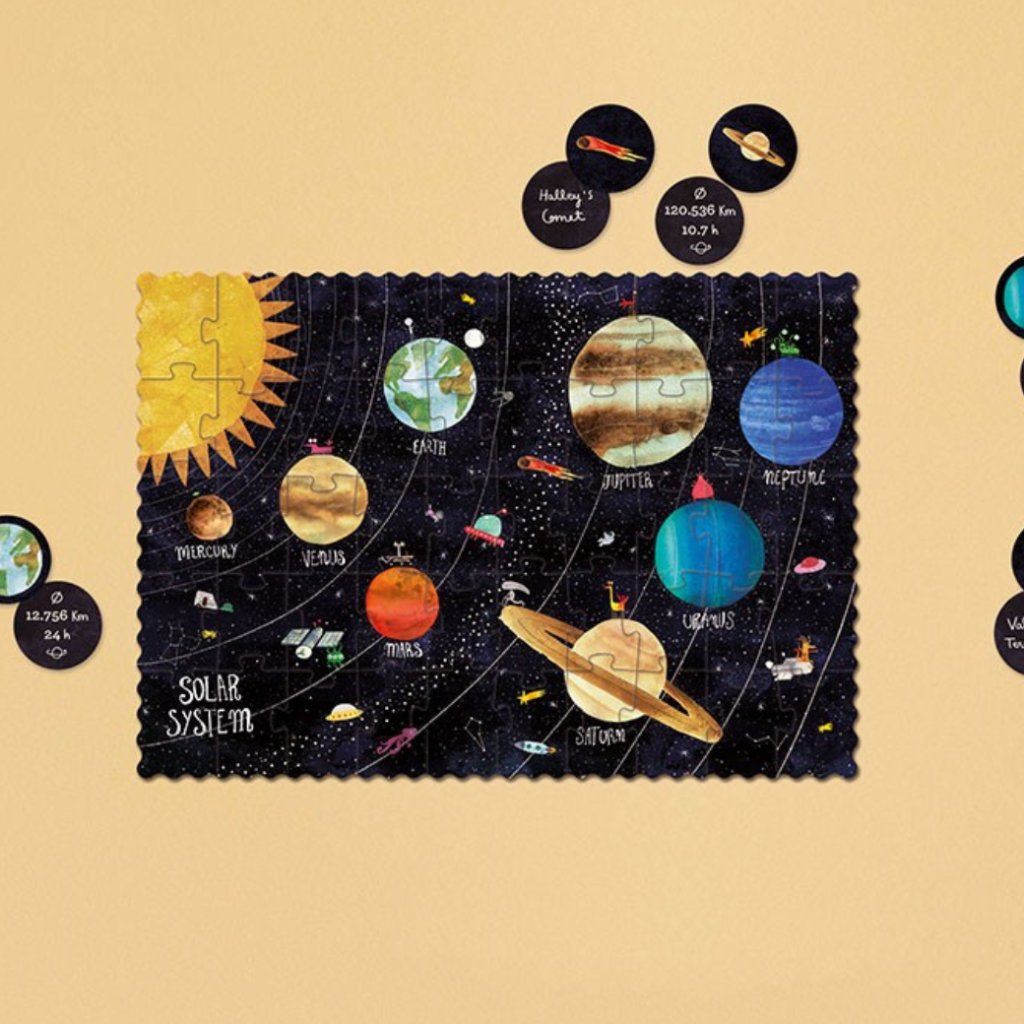 Malé puzzle s 50 dílky obsahuje navíc 12 dílků na pozorování, se kterými se dozvíte víc o planetách a vesmíru. Udržitelná a lokálně vyrobená hračka. Díky kapesní velikosti je ideální na cesty!