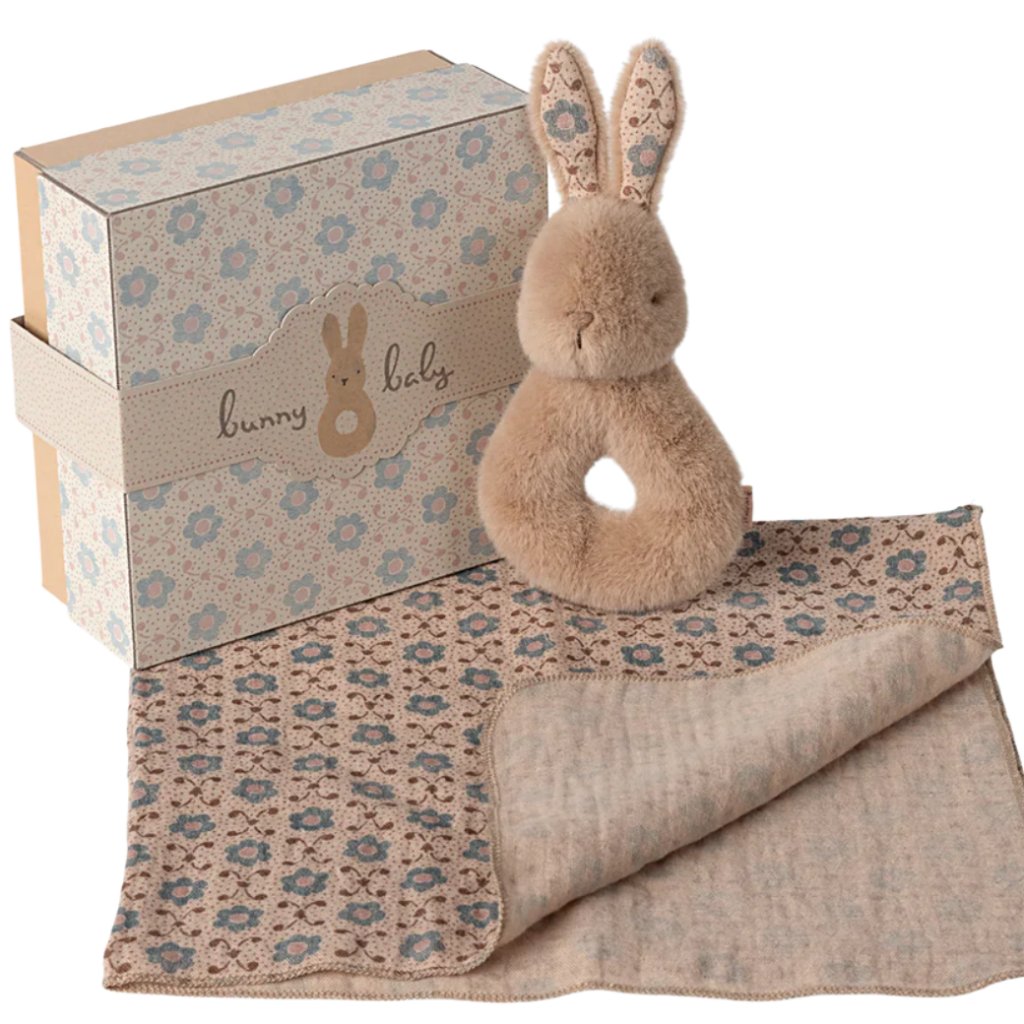 Tento nádherný dárkový set od Maileg je jako stvořený pro novorozené miminko. Obsahuje měkký bavlněný hadřík a malého králíčka s jemným chrastítkem uvnitř, který při pohybu vydává uklidňující zvuk. Oba kousky jsou sladěny do teplého odstínu Cream Peach a zabalené v elegantní dárkové krabičce.