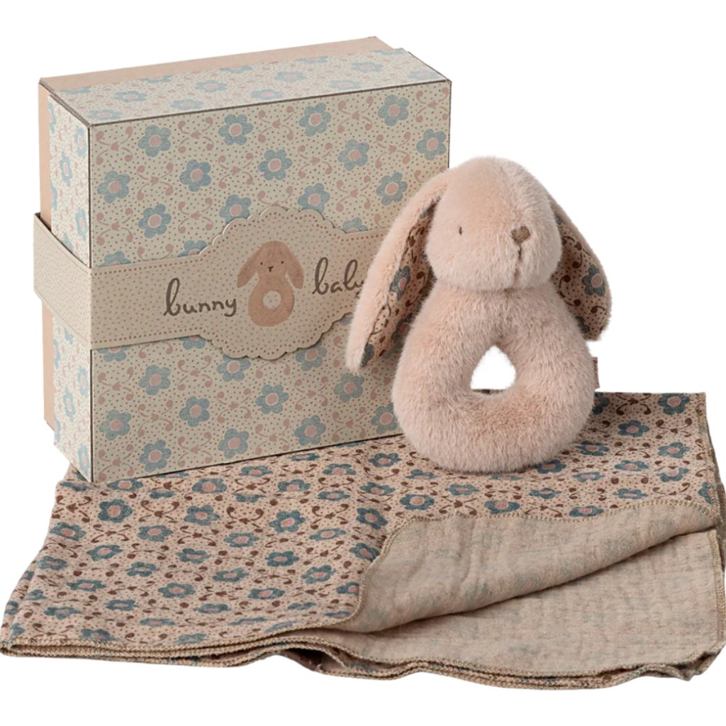 Roztomilý dárkový set od dánské značky Maileg obsahuje dvě nepostradatelné maličkosti pro vaše nejmenší – měkký bavlněný hadřík a jemné chrastítko ve tvaru králíčka v něžném odstínu Powder. Králíček má v bříšku zabudované chrastítko, které vydává příjemný zvuk, ideální pro stimulaci smyslů miminka.