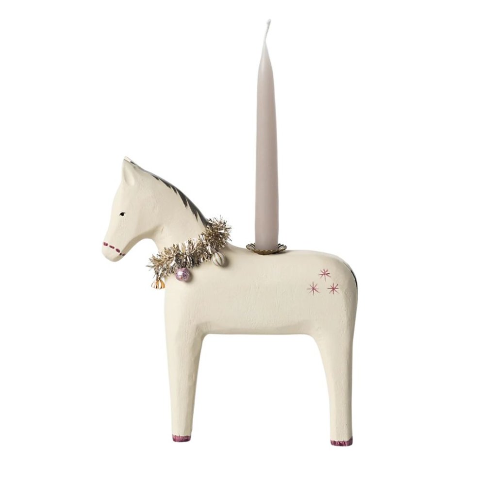 Dřevěný svícen ve tvaru koníka v menší velikosti, na jednu svíčku (není součástí). Rozměr: 16 x 14 cm