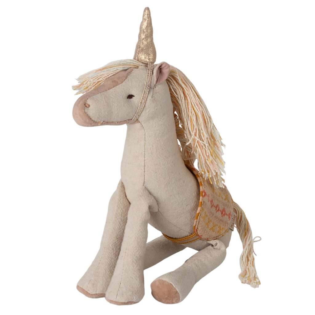 Kouzelný příběh právě začíná! Tento nádherný jednorožec v jemných, pastelových tónech s třpytivým zlatým rohem je připraven stát se hlavní postavou ve světě fantazie. Ať už vaše Maileg postavičky vyrážejí na pohádkové dobrodružství nebo se jen chtějí nechat unášet sny, tento jednorožec je ideálním společníkem.