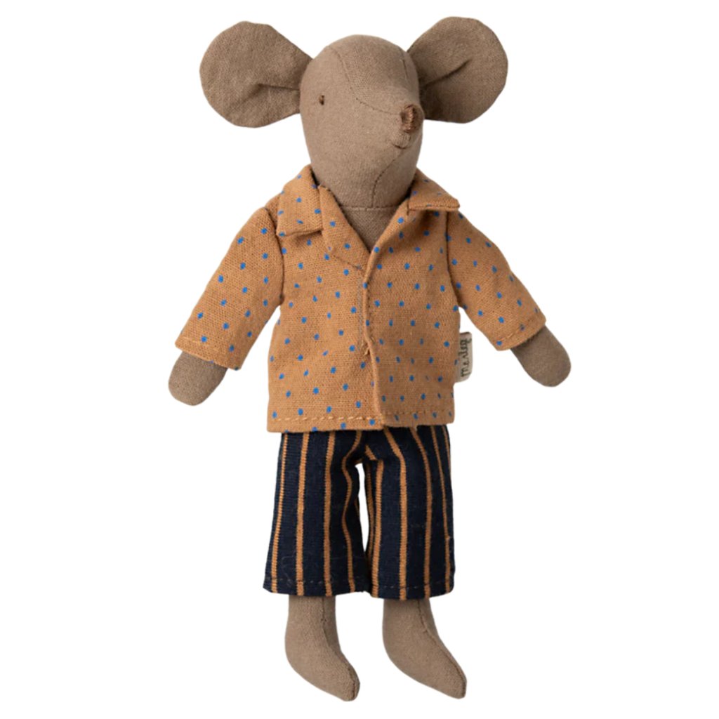 Oblečte myšího tátu do nových šatů. Set se skládá z puntíkované košile a pruhovaných kalhot.