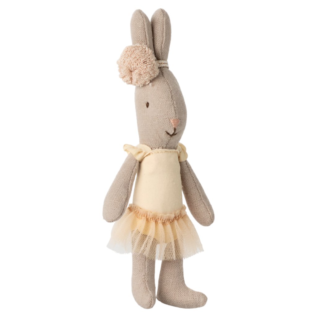 Roztomilý králíček ve velikosti Micro z kolekce Maileg je oblečený do jemného krémového baletního oblečku s tylovou sukýnkou. Na ouškách má drobnou ozdobu, která dotváří jeho půvabný vzhled. Díky výplni z kuliček může králíček samostatně sedět a je ideální pro hru i jako milý dárek.