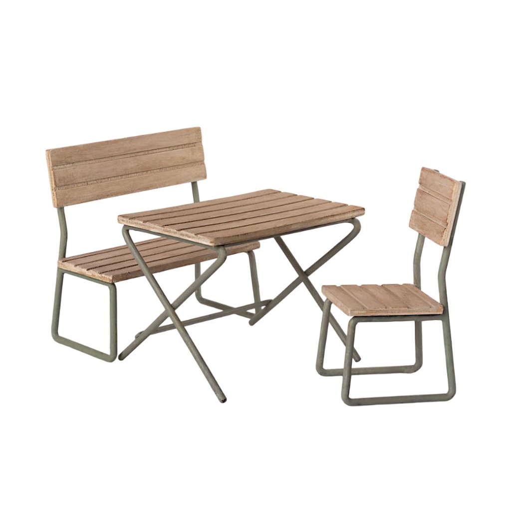 MAILEG Miniaturní zahradní set – Stůl se židlí a lavicí