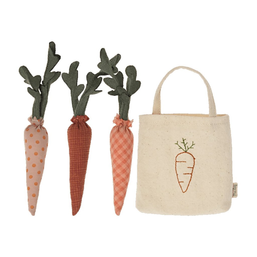 Každý králíček potřebuje svůj zásobník na oblíbenou zeleninu! Tahle rozkošná sada tří mrkviček v látkové taštičce od Maileg je ideálním doplňkem do myší kuchyňky nebo obchůdku. Kombinace různých vzorů a jemných barev dodává hře kouzelný nádech.
