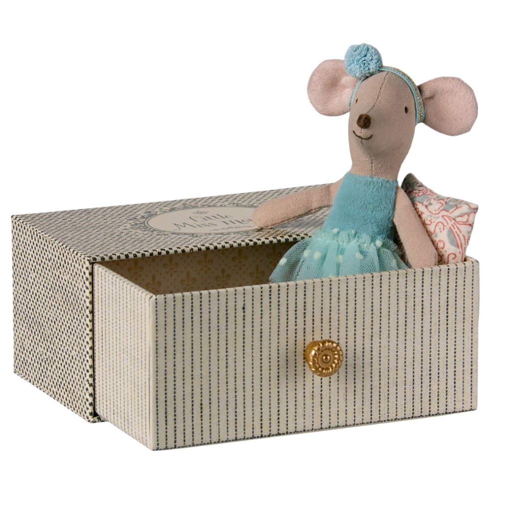 Krásná myší slečna v krabičce od zápalek, která bude skvělou parťačkou do vaší myší rodinky. Tato malá myška – sestřička přichází v krásné krabičce, kterou může používat jako lehátko nebo postýlku během dne.
