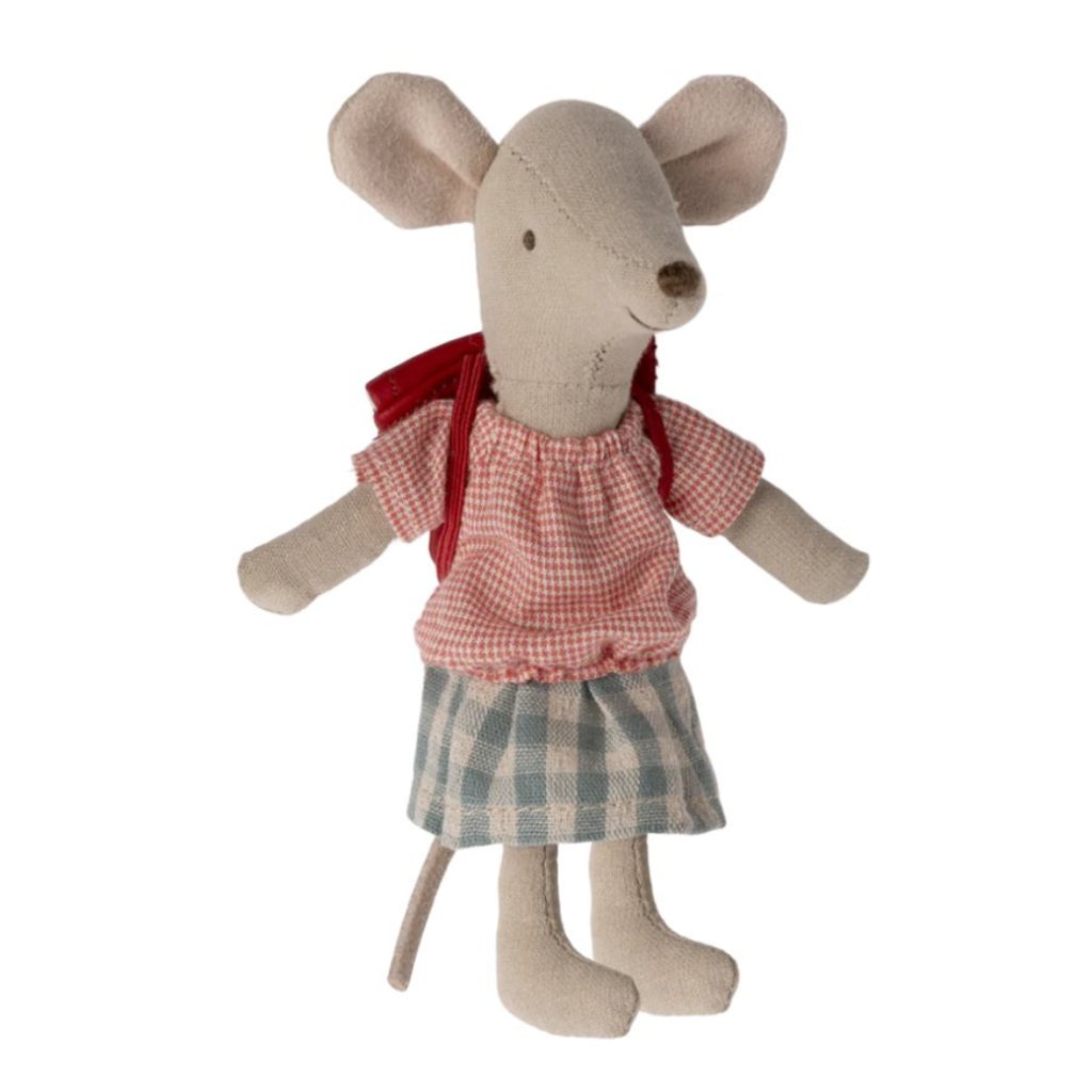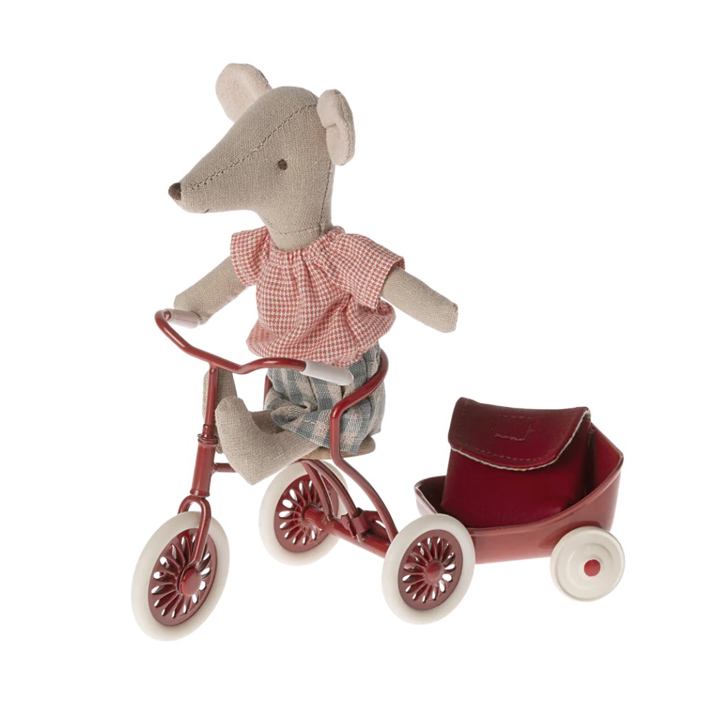 Myška, která je oblečená na den ve školce nebo ve škole. V rukou má magnety, takže může pevně držet rukojeti tříkolky pro rychlý výlet.