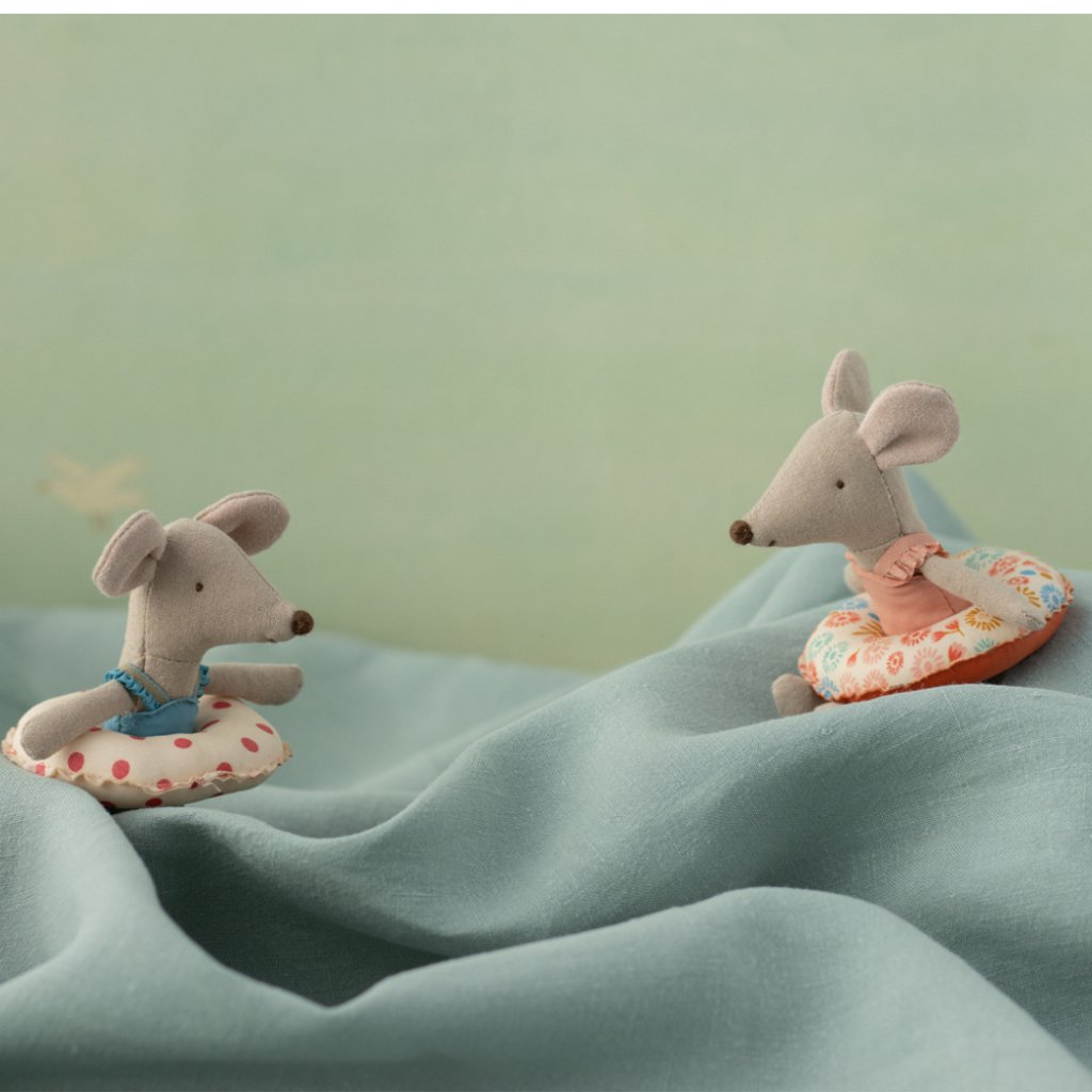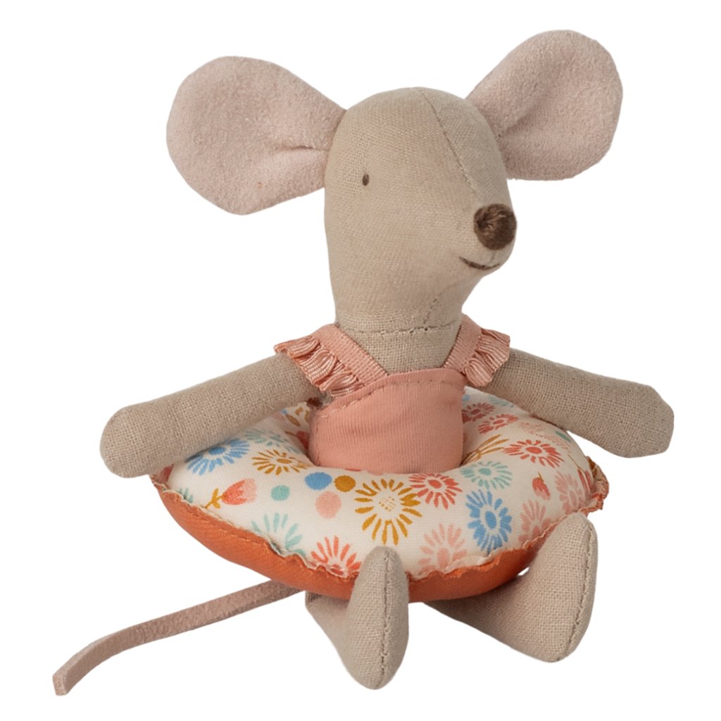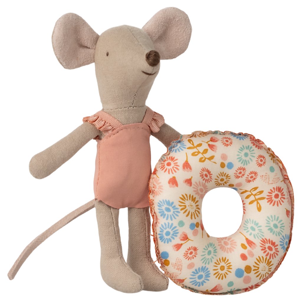 Léto volá! Tato roztomilá myška – malá sestřička je připravena na den plný slunce a zábavy u moře. Oblékla si plavky a kolem bříška má svůj oblíbený barevný nafukovací kruh, který jí zajistí bezpečí i styl během každé koupačky.