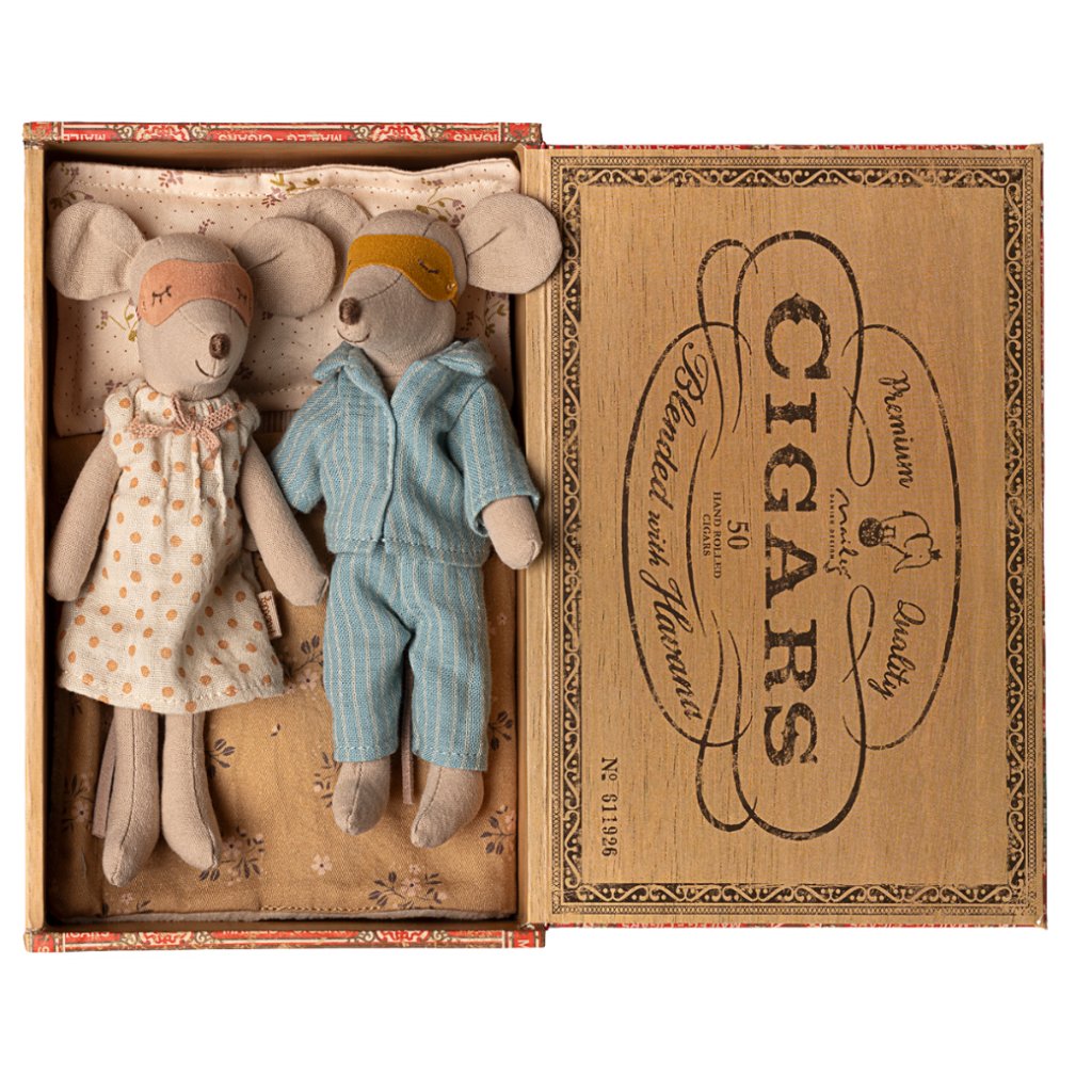Klasický kousek z kolekce Maileg. Maminka a tatínek myšky jsou oblečeni do krásných nočních úborů a mají masky na oči pro klidný spánek. Jejich postelí je stylová krabička od doutníků, která slouží jako útulné lůžko pro sladké sny.