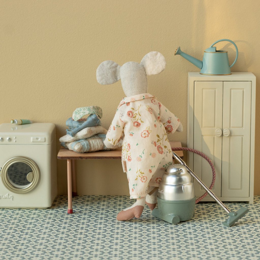 Krémová skříňka pomáhá myší rodince udržet oblečení hezky uspořádané. Uvnitř najdete tři zlatá ramínka, která vybízejí k převlékání, třídění a vytváření každodenních scén z myšího světa. Krásný doplněk, který obohatí hru o nové detaily a příběhy.