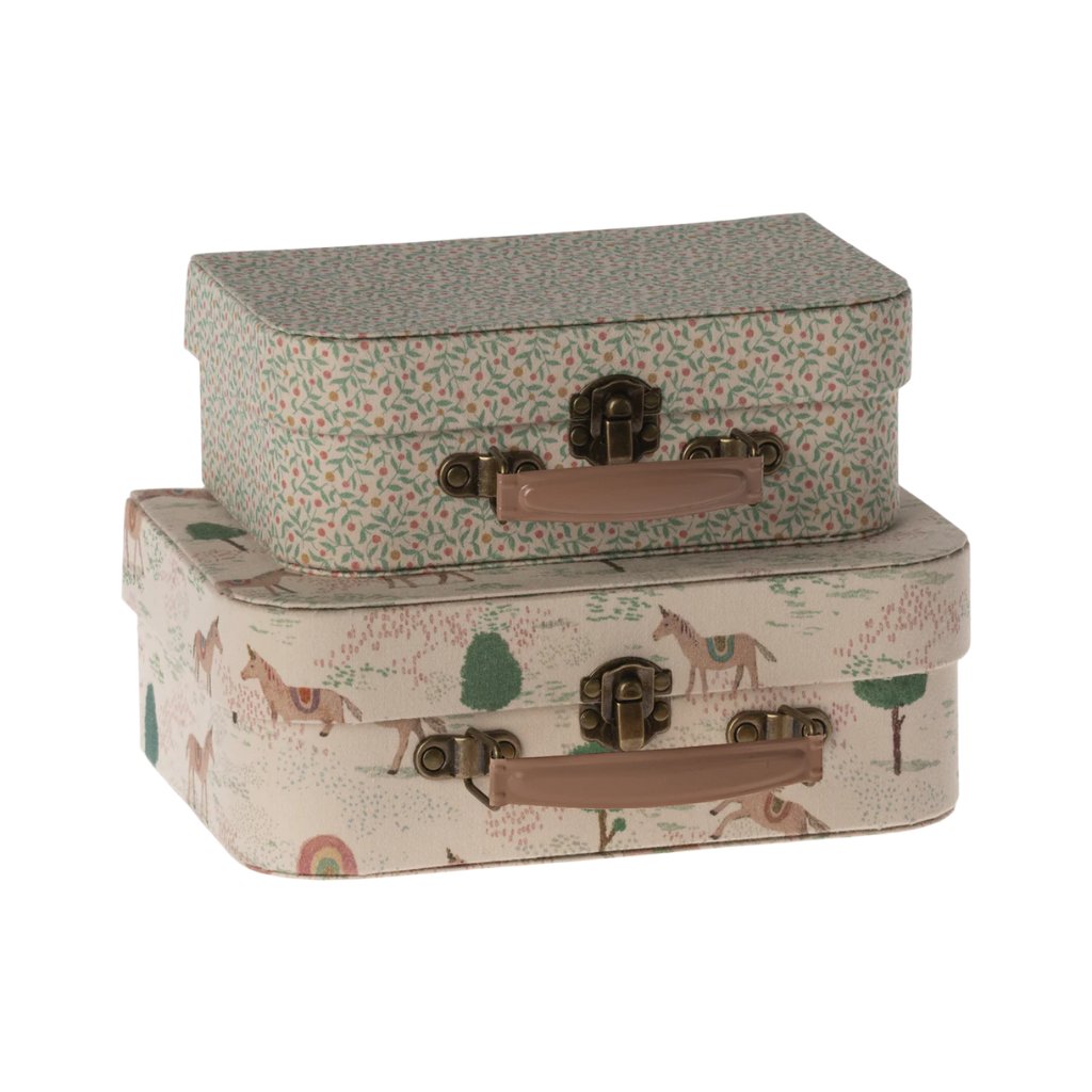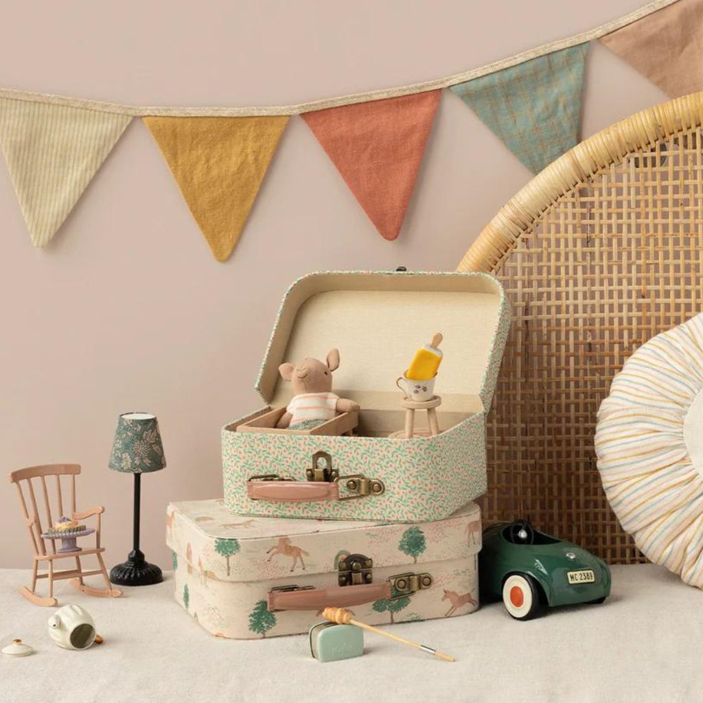 Perfektní sada kufříků pro uložení všech vašich oblíbených hraček. Každý kufr je potažen unikátní látkou Maileg a má barevná kovová madla.