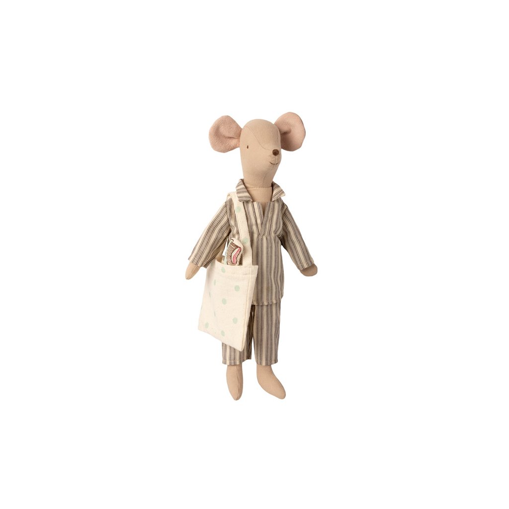Tento set od Maileg je dokonalou výbavou pro každého myšáka, který se chystá na přespání u kamaráda. Obsahuje měkké pruhované pyžamo, malý kartáček na zuby a tašku, do které se vše úhledně sbalí. Děti si zamilují, jak realisticky tento set působí — ideální doplněk k večerním hrám před spaním!